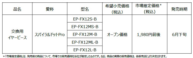 「スパイラルドットPro」イヤーピース、「スパイラルドット+(プラス)」イヤーピース、「スパイラルドット」イヤーピース付属機種含む、当社製イヤホン(関連リンク:https://www.victor.jp/headphones/lineup/ep-fx12/)