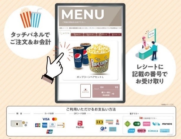 ティ・ジョイオリジナルで開発した本システムは、劇場内に設置されたタッチパネル端末から注文・決済が出来る【セルフオーダーレジ】と、オンライン座席予約システムKINEZOを通じて、スマートフォンからの注文・決済も可能な【KINEZOモバイルオーダー】となっております。