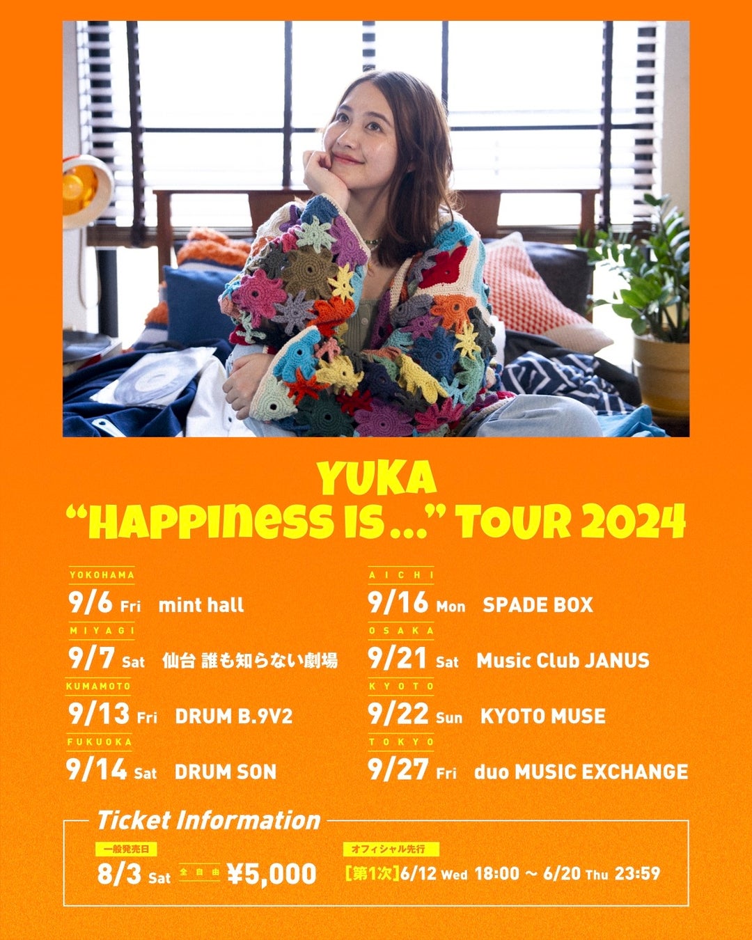 9月に開催されるワンマンツアー『YUKA “Happiness is … ” TOUR 2024』は全編アコースティック編成となっている。東京、大阪を除くエリアは2023年2月に開催されたメジャーデビューワンマンツアー以来の1年半ぶりのツアー開催となる。オフィシャル第1次先行も開始しているので奮って応募しよう。