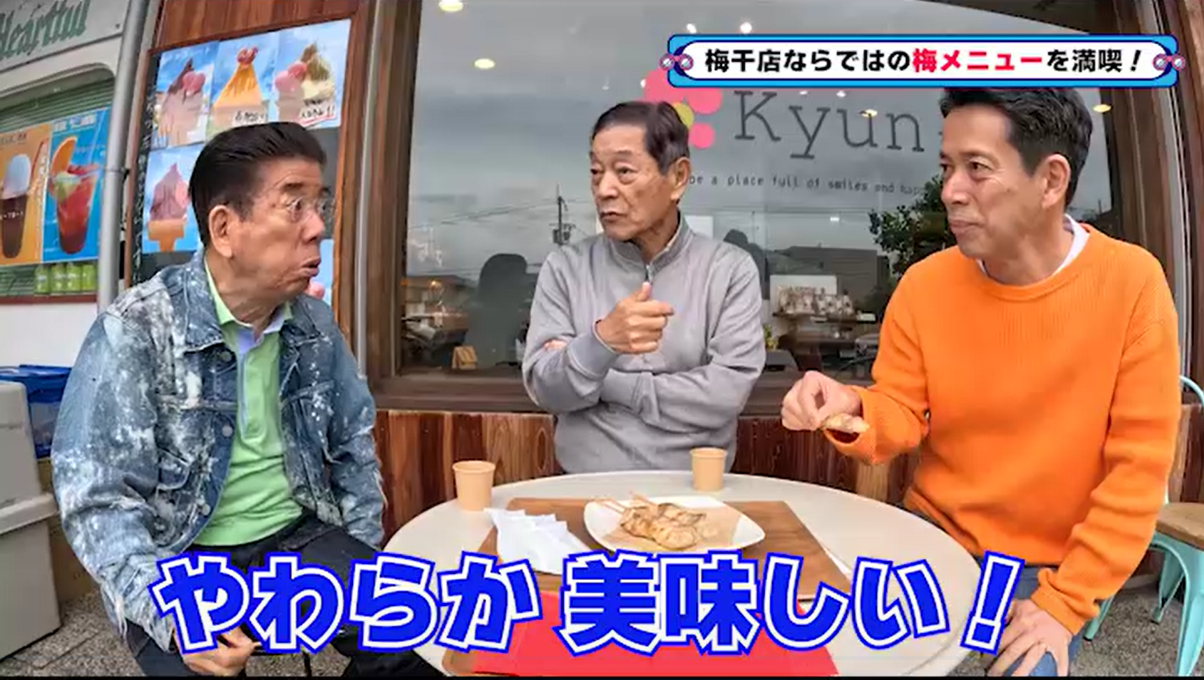 また、梅が一粒ごろんと入ったジュースをいただくと、きよしは「美味しい!」と瞳孔を全開。八方と忠志も「さわやか~」と口をそろえるなど、3人ともここでしか味わえないオリジナル梅メニューに大満足な様子でした。