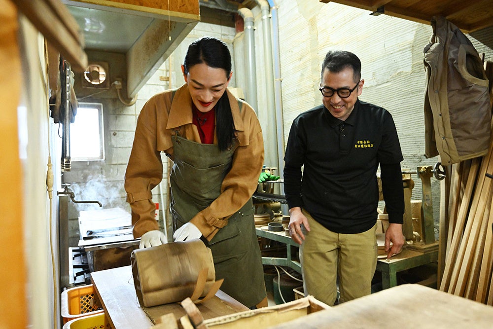そして「硬い木をどうやって曲げてるのか?」という謎を解き明かすため、上達に5年はかかるといわれる「曲げ加工」に冨永愛が挑戦。80℃の熱湯で煮たスギの木を素早く取り出し丸い形に曲げていくが、力を要する作業で大苦戦。ようやく曲げたと思ったら…「バキッ」。力を入れないと曲がらないし、力を入れすぎると折れてしまう。しかも素早く曲げないと、木がどんどん硬くなってしまうという、非常に難しい作業だということを身をもって体験する。一回目の挑戦では木を折ってしまった冨永だが、リベンジすべく再度挑戦。はたして結果は?