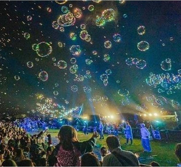 多種多様なシャボン玉を夜空とビーチを背景にライトアップ。