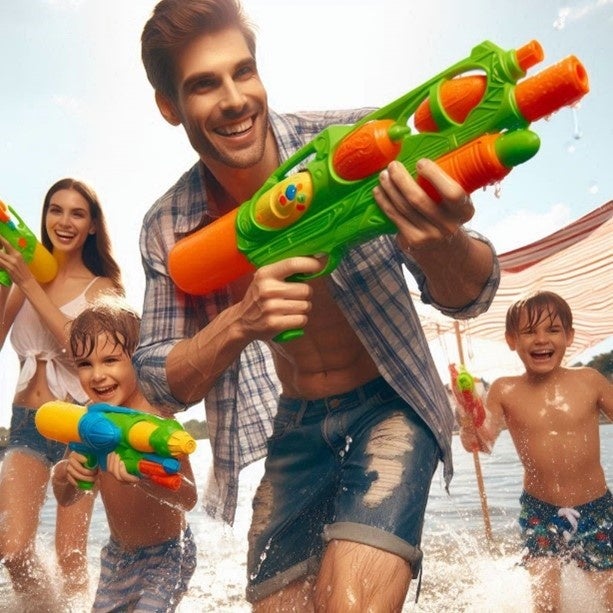 頭に付けたポイを狙って水鉄砲を撃つウォーターサバゲ―が、誰でも体験できるフリースペースで登場!