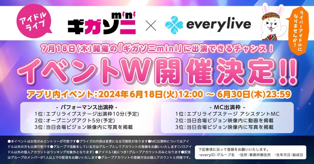 エブリライブ株式会社(本社:東京都新宿区・代表取締役:佐々木尚之・URL:https://everylive.jp/)が運営するライブ配信アプリ「everylive(エブリライブ)」は、7月18日に開催されるアイドルイベント「ギガソニmini」に協賛いたします。協賛に伴い、パフォーマンス枠とMC枠の2つの出演枠で「ギガソニmini」への出演権を争うイベントを6月18日から同時開催いたします。
