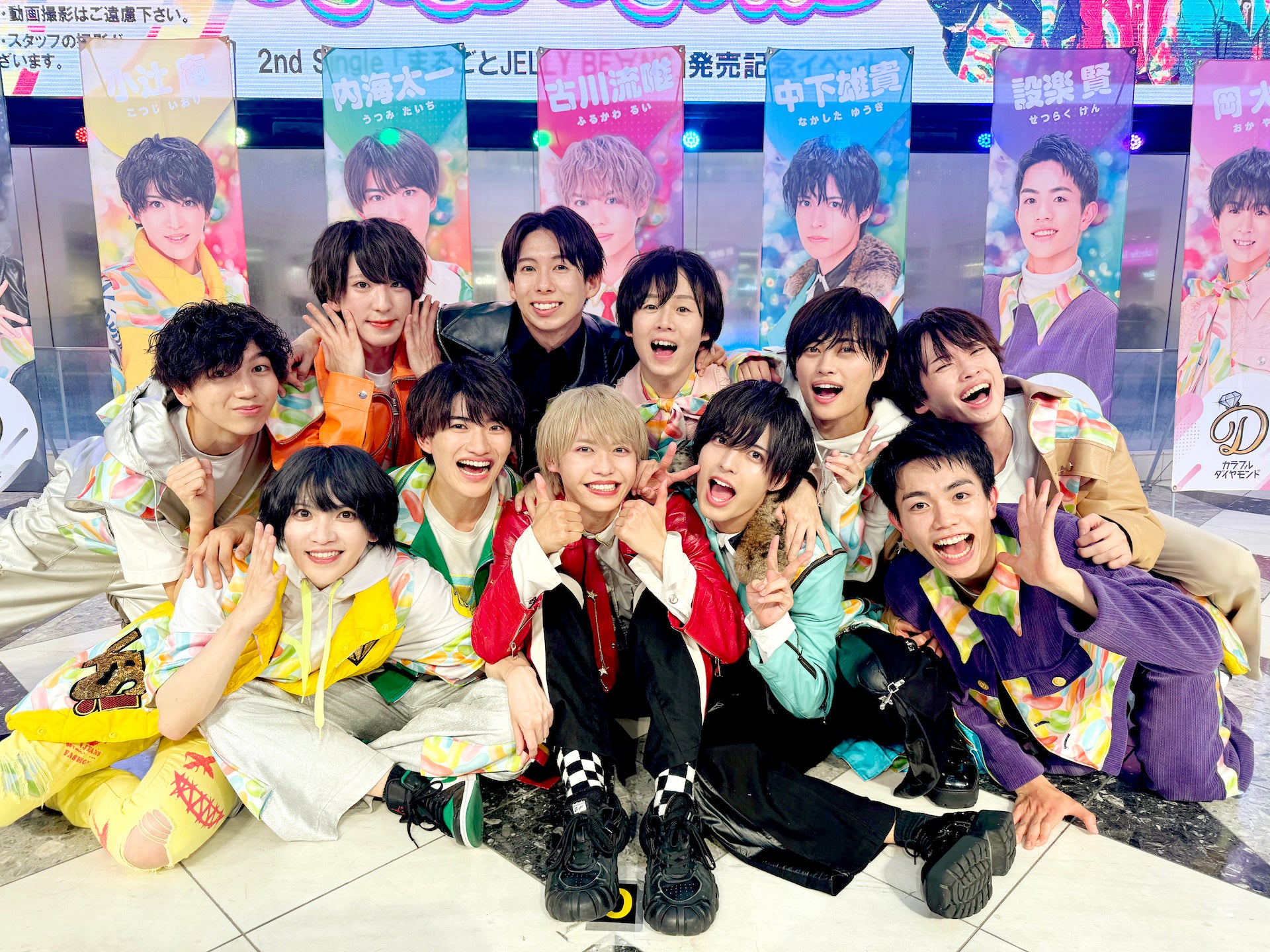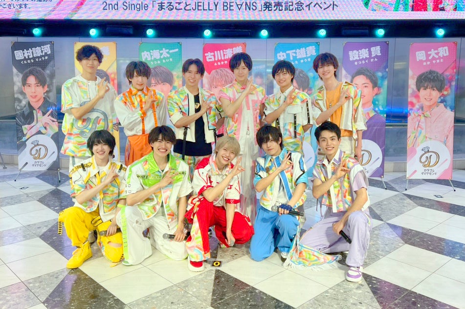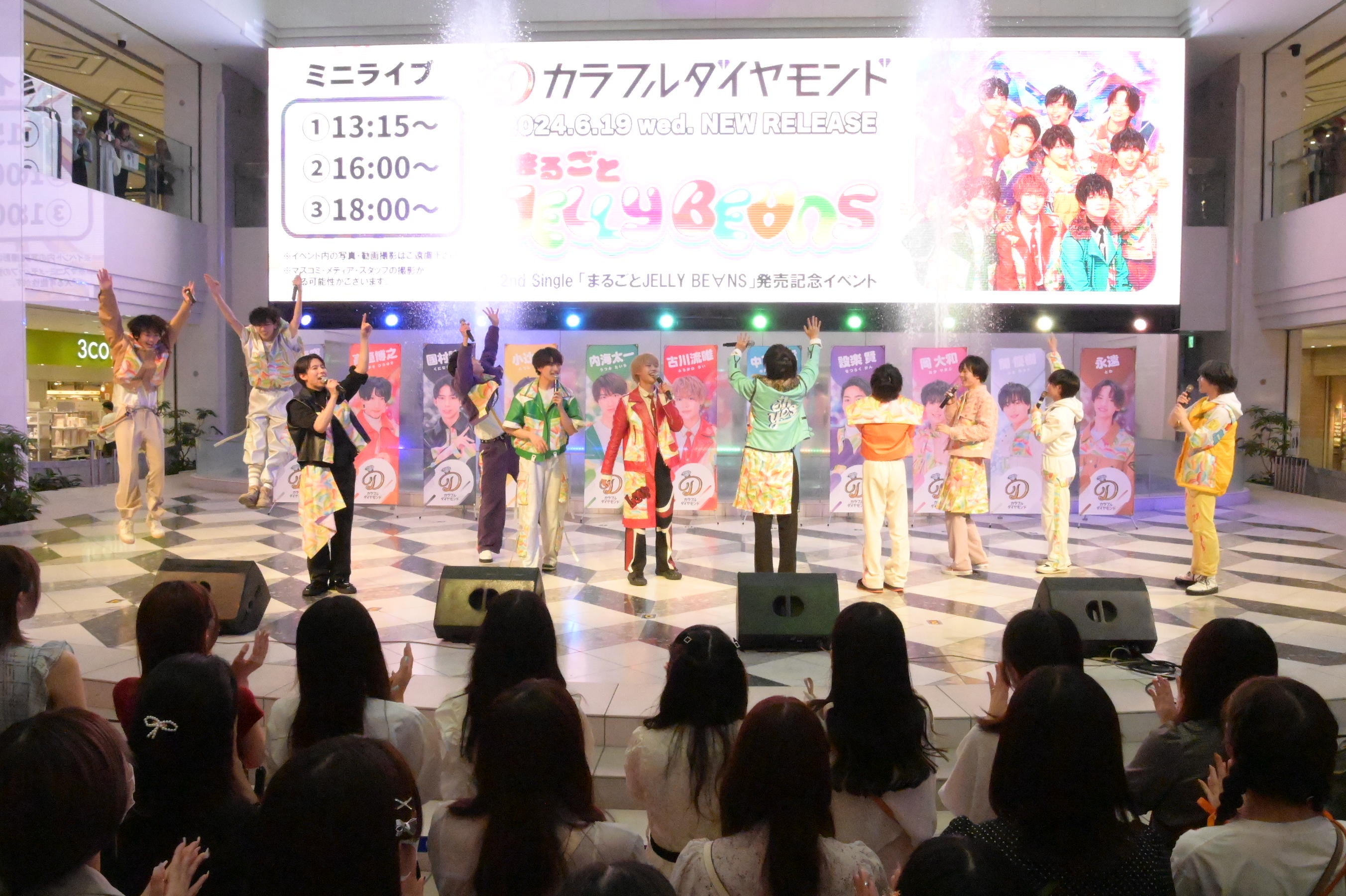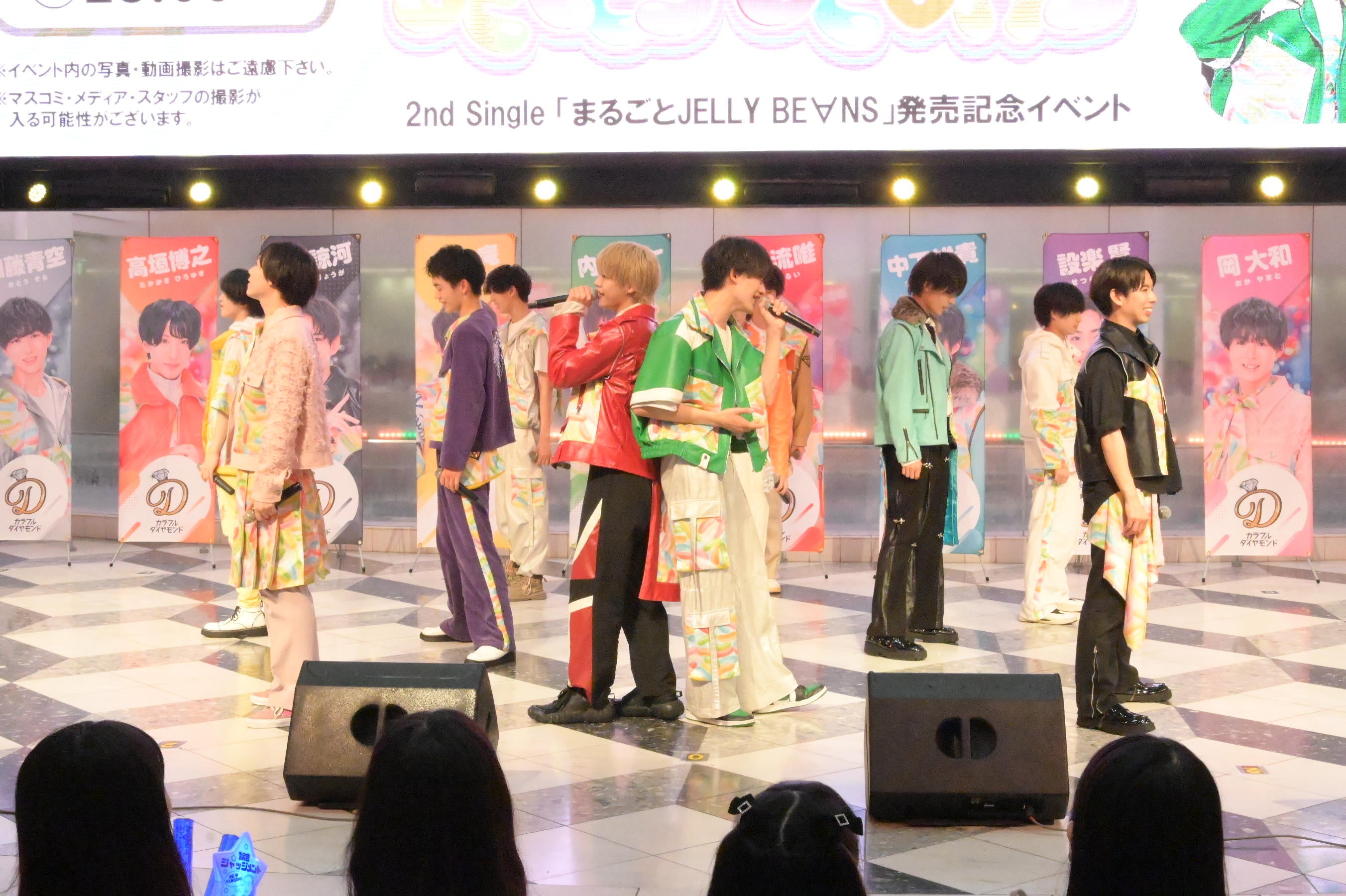 と全力でファンのみんなを永遠に応援していくメッセージを吐露。新曲の発表から3ヶ月間、じっくりと磨き上げてきた『まるごとJELLY BE∀NS』の歌声は、池袋サンシャインの噴水広場をカラフルでキラキラな色に染めた。
