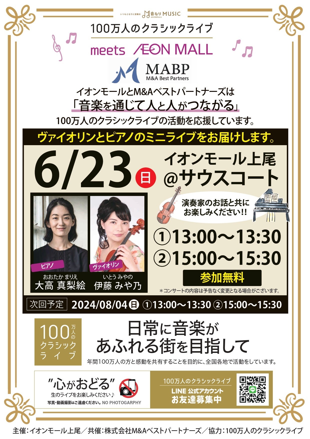 製造、建設、不動産、医療・ヘルスケア、物流、ITに特化したM&A仲介を⾏う株式会社M&Aベストパートナーズ(本社:東京都千代田区、代表取締役社長:齋藤 達雄 以下M&Aベストパートナーズ)と、一般財団法人100万人のクラシックライブ(東京都千代田区、代表理事:蓑田秀策 以下100万人のクラシックライブ)は、6月23日(日)13:00~/15:00より、イオンモール上尾にて、クラシックライブを開催することをお知らせいたします。