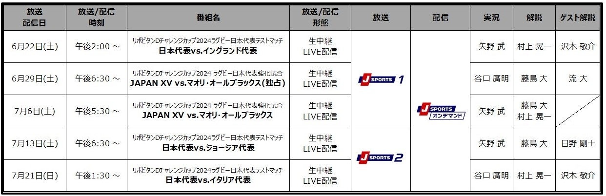 <リポビタンDチャレンジカップ2024 ラグビー日本代表/JAPAN XV 2024年6-7月放送/配信予定>