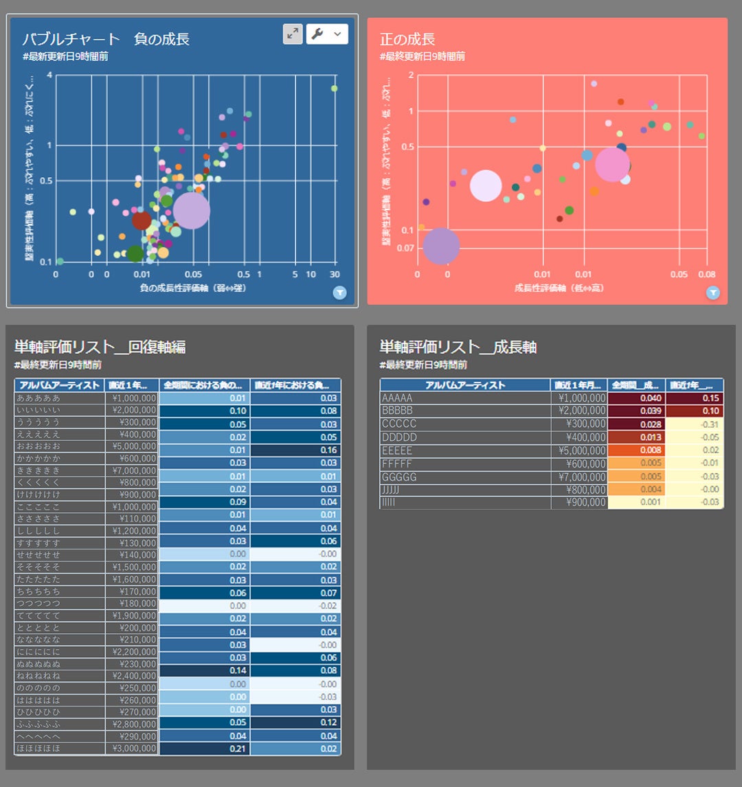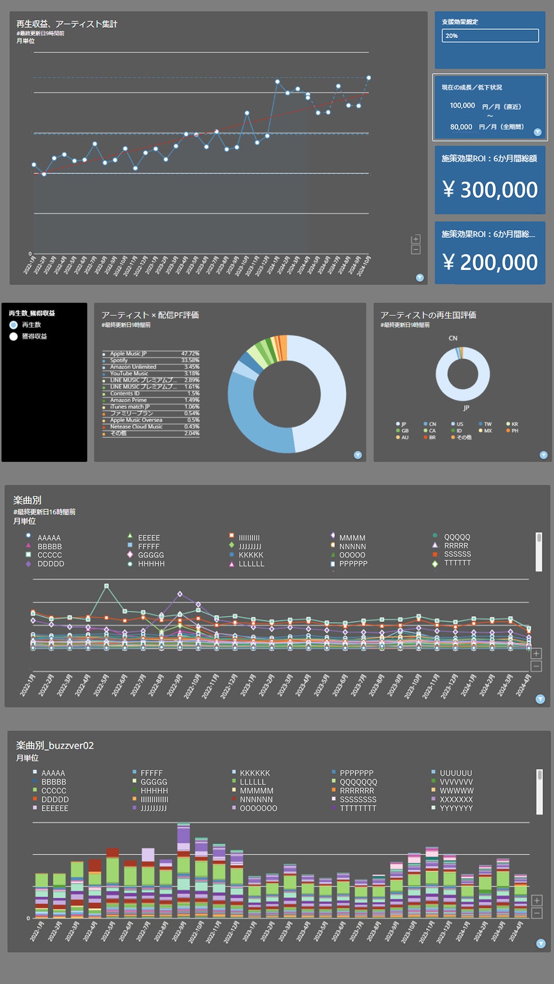 ・データ分析と視覚化:アーティスト/楽曲のストリーミングの再生データや売上データを総合的に分析し、成長性を視覚的にわかりやすく表示します。