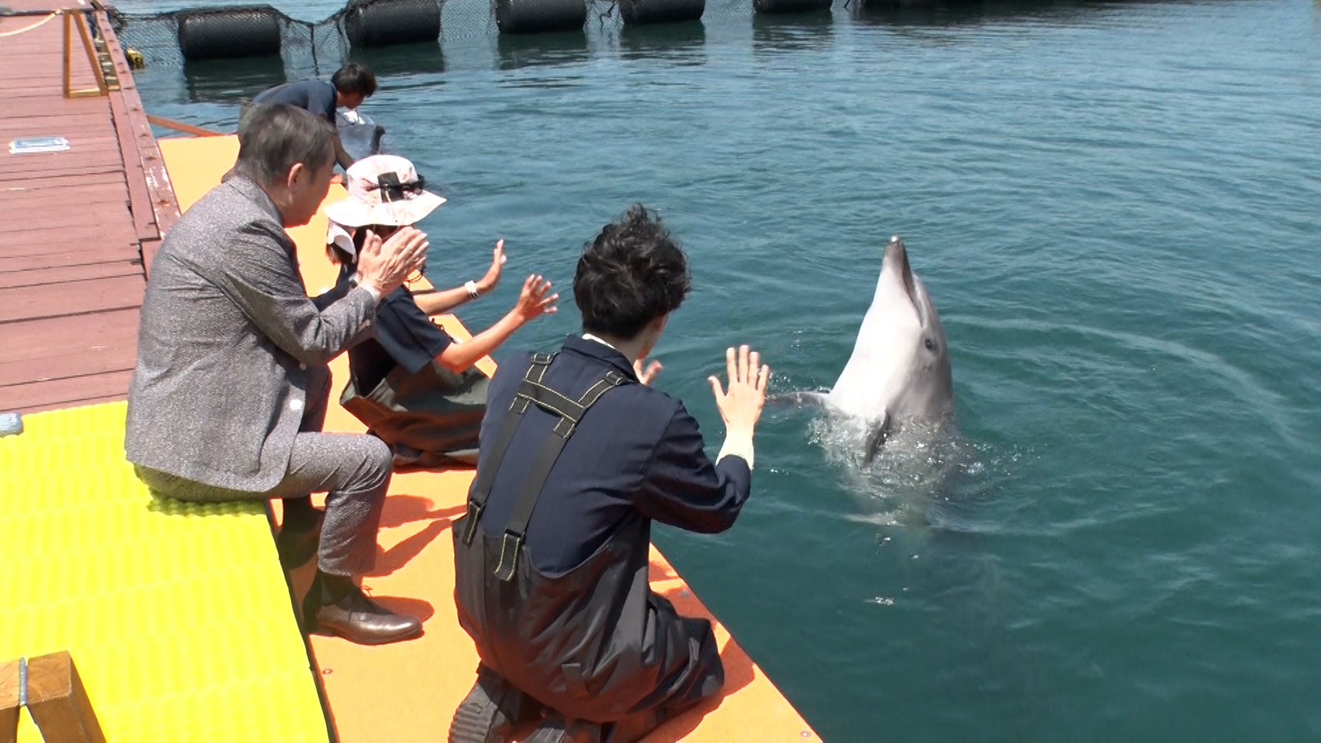 さっそくスタッフの方に案内されてイルカと触れ合う2人。イルカの背をなでた文枝は、「レインコートみたいですね」と独特な感想で笑いを誘います。