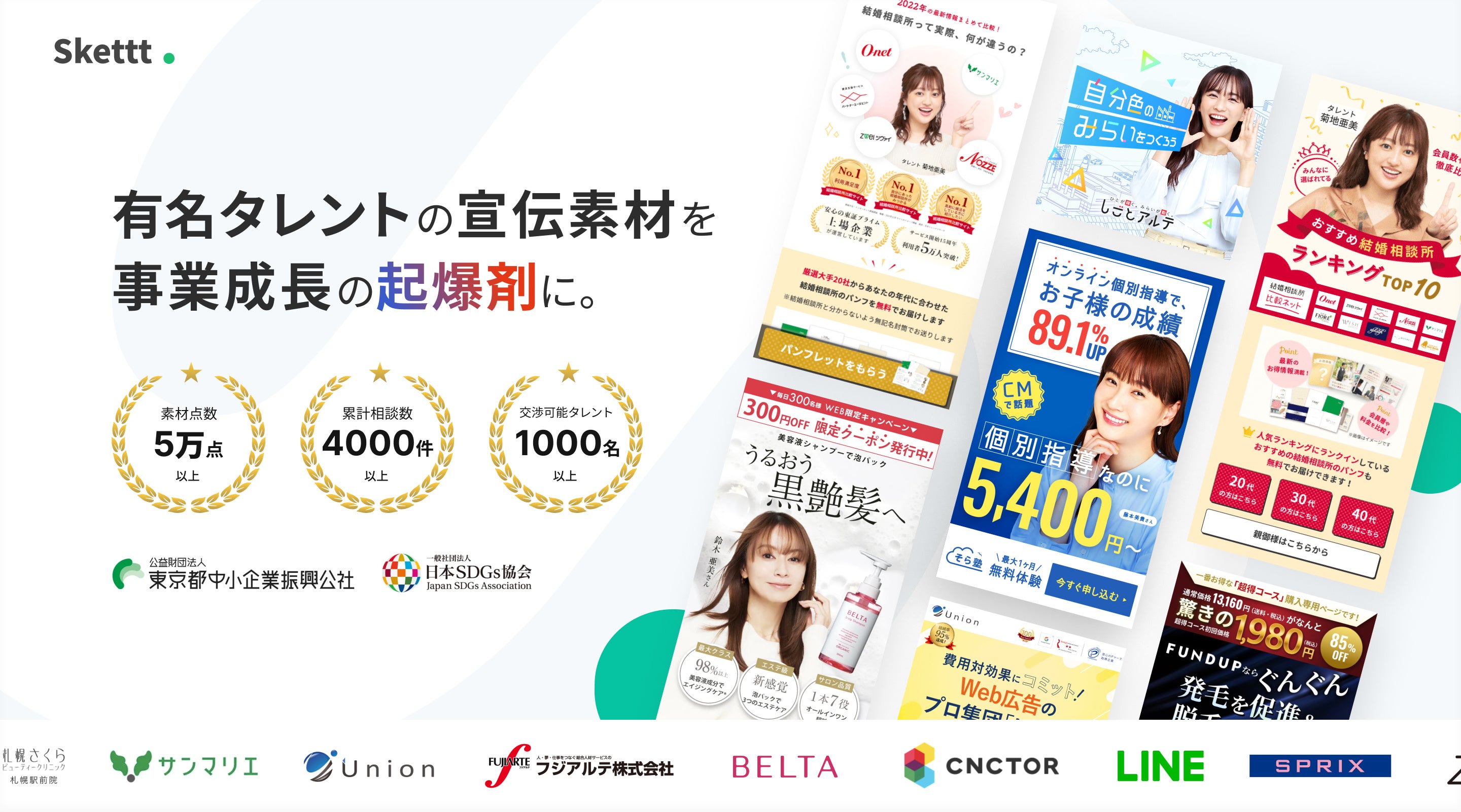 『Skettt』は、地方・成長企業の認知獲得・売上向上の支援に特化し、有名タレントの宣伝素材提供をはじめとするIP活用を軸としたマーケティング支援を提供するサービスです。
