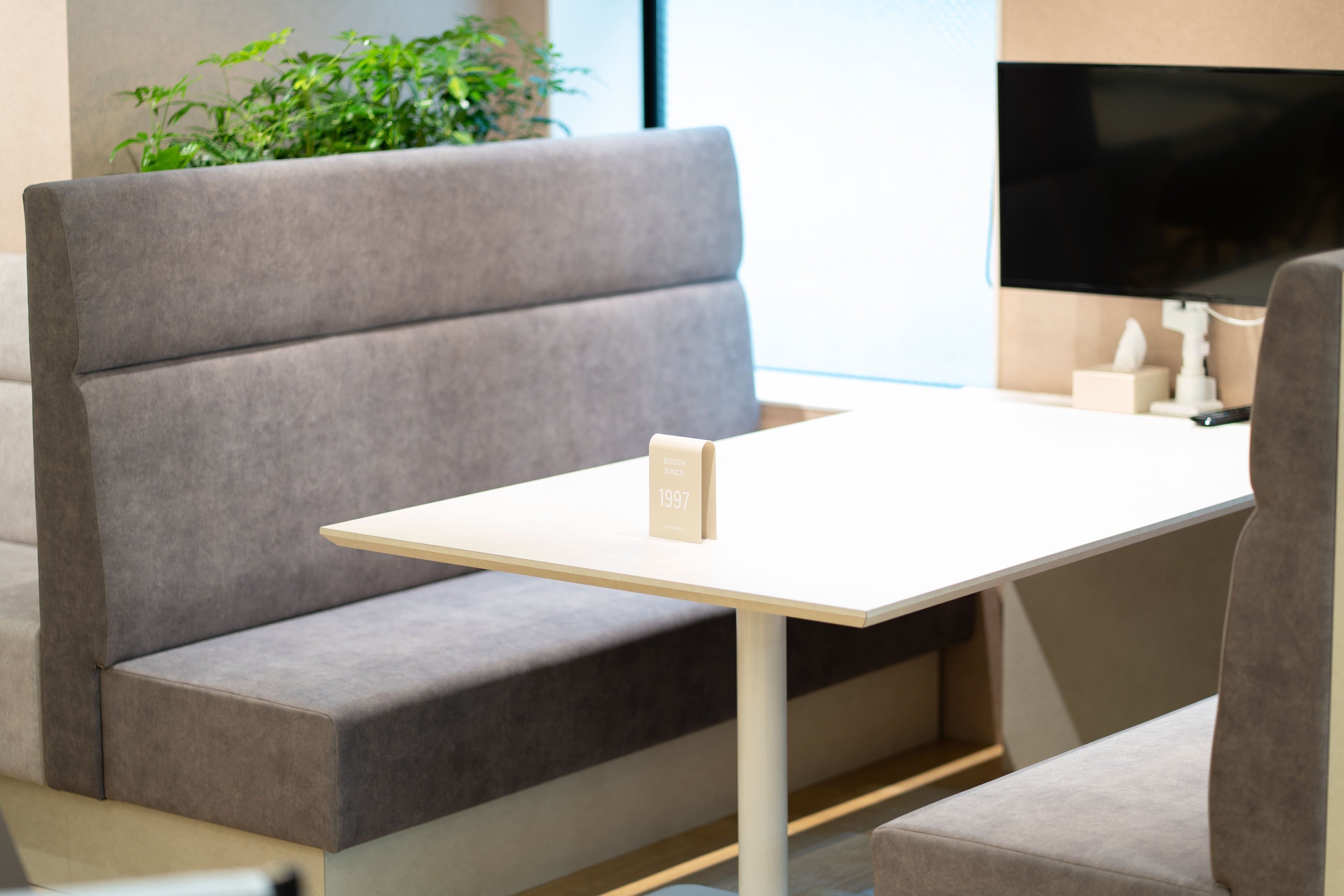 全体的にメインテーマの「光」を意識し、明るめの白とグレー基調とした空間に、サブテーマの「土」を連想させるような色味を差し色として加えています。