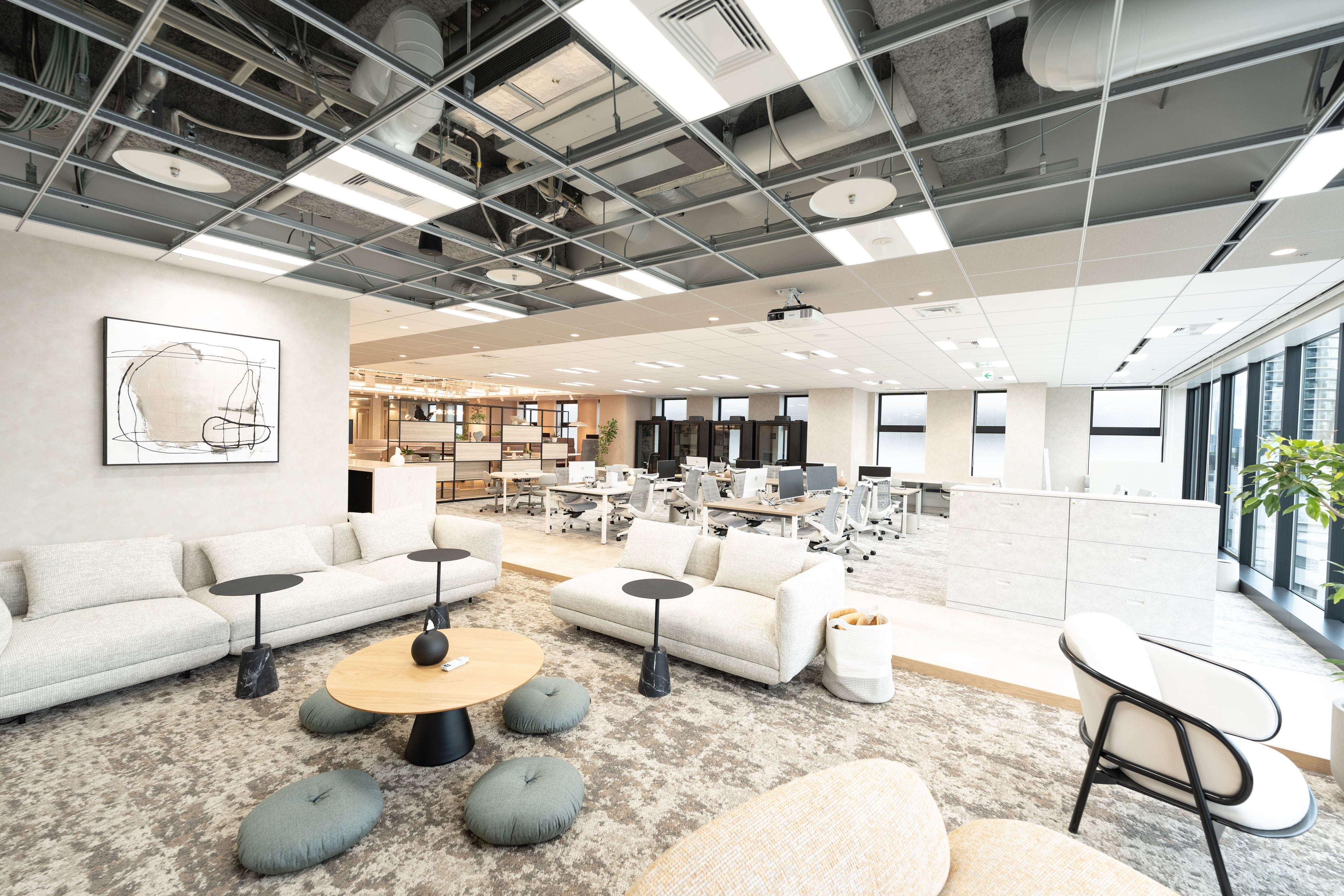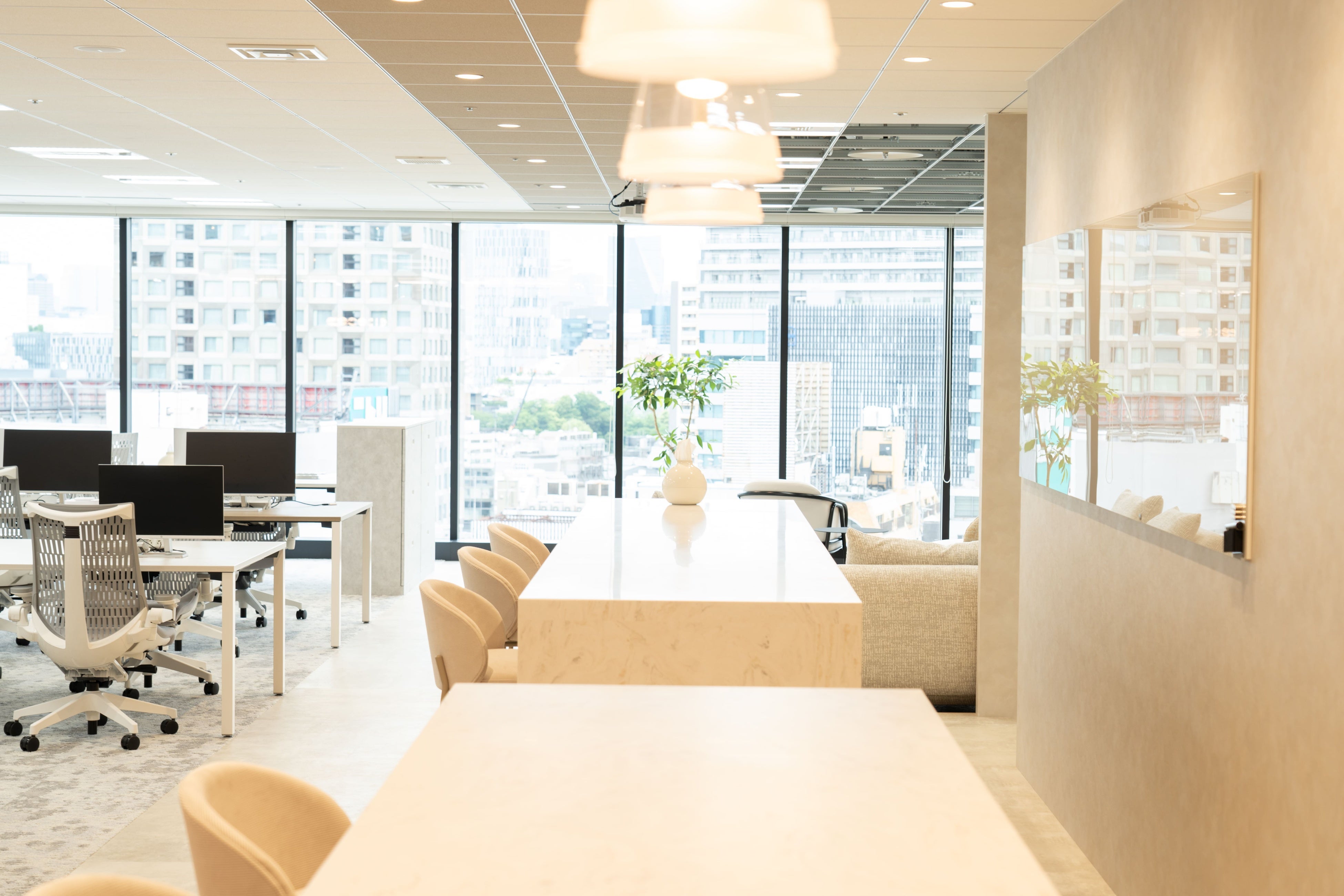大きな窓から差し込む自然光がオフィス全体に行き渡るよう、不要な壁を排除しました。太陽光の温もりとエネルギーをすべての仲間に届けられるような設計になっています。