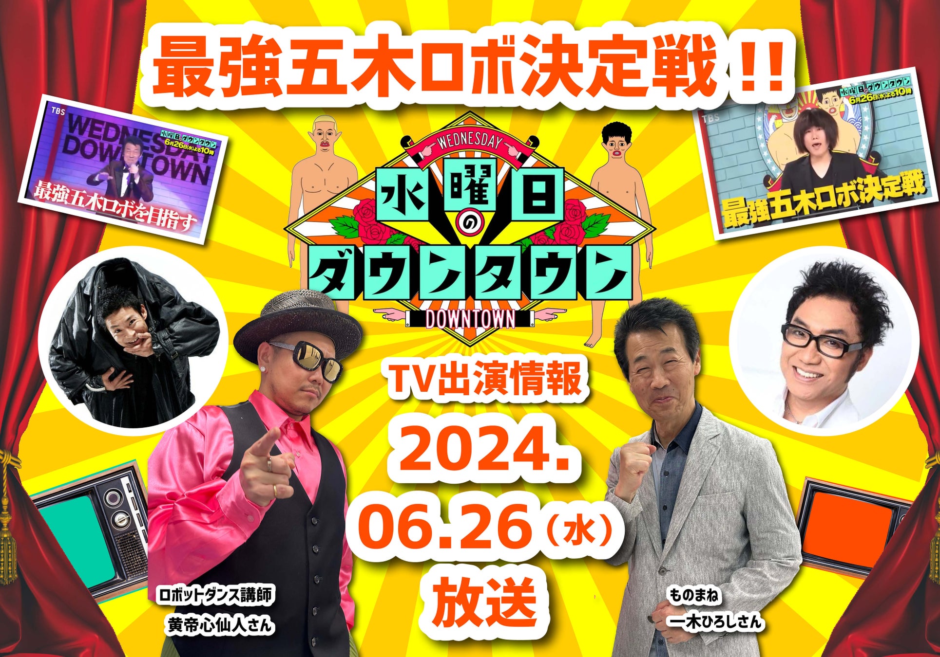 ■出 演:【MC】ダウンタウン 【プレゼンター】スーパー・ササダンゴ・マシン、ランジャタイ 【パネラー】川島明(麒麟)、みちょぱ、ケンドーコバヤシ、朝日奈央 【出演】コロッケ、一木ひろし、黄帝心仙人、EBIKEN 他