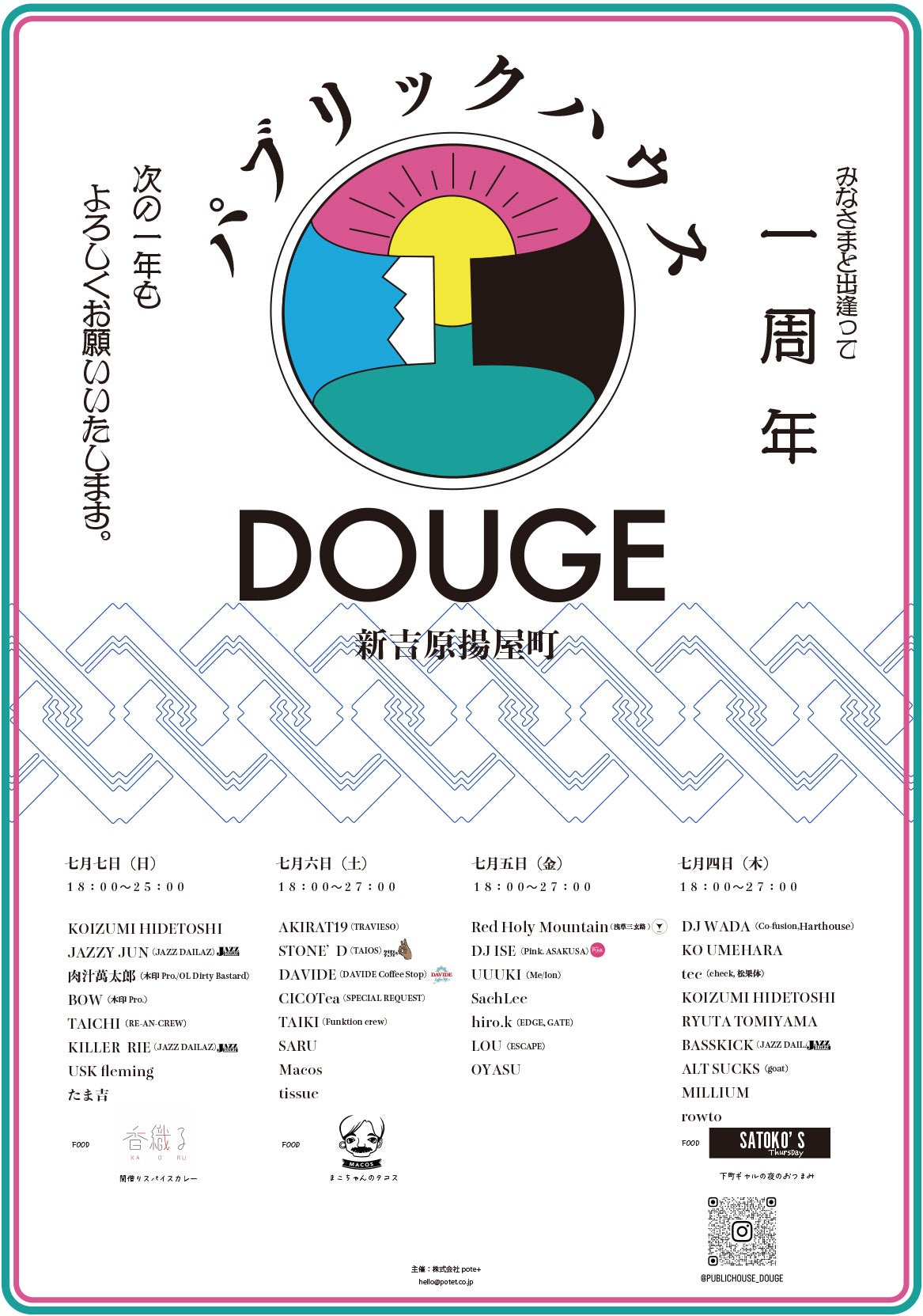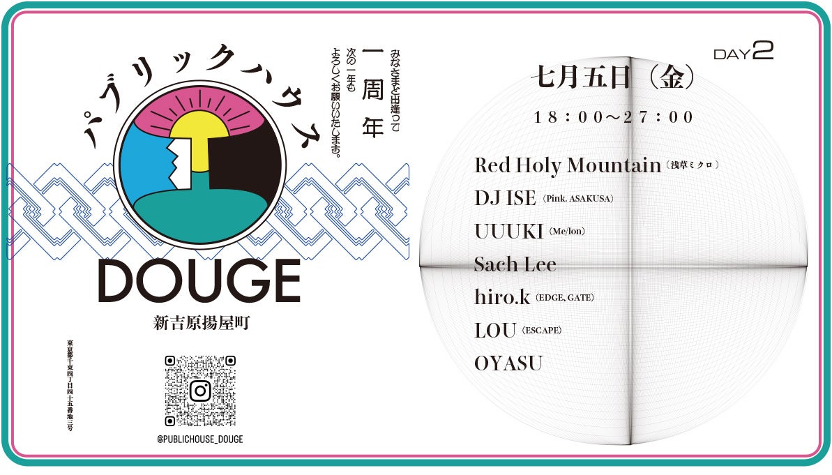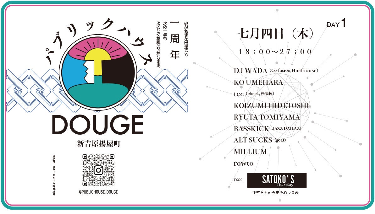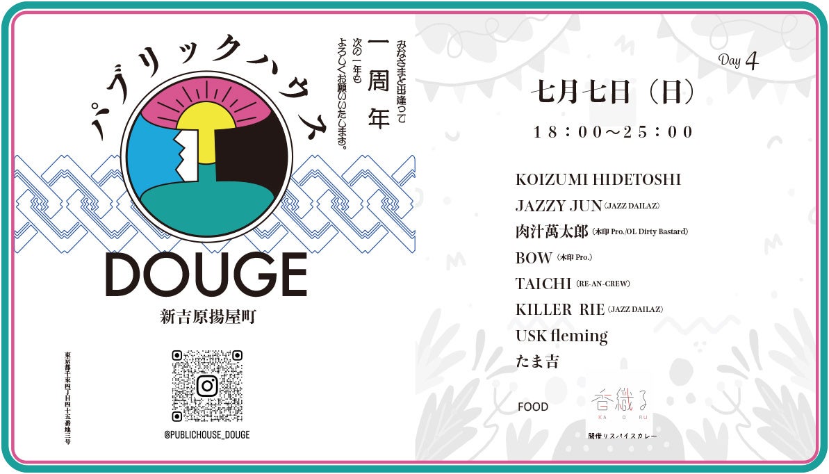 旧新吉原遊廓内にアート/ミュージック/お酒をコンセプトに大衆居酒屋として2023年7月にオープンした”パブリックハウス道解”が、1周年を迎えるアニバーサリーパーティーを7月4日から7日までの4日間にわたり開催!