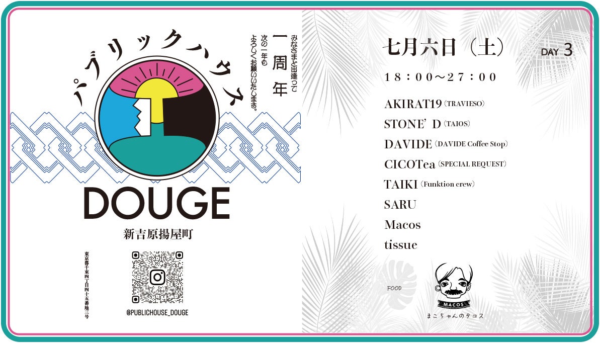 DAY 3の土曜日は、前日までの四ツ打ちコンセプトからガラリと雰囲気を変え、生音を中心としたラインナップが用意された。レゲエ、ラバーズロック、ヒップホップ、ソウル、ブルース、アフロと、まったり〜気持ちいい極上の選曲でトロピカルでアダルトな夜を演出。AKIRAT19とSTONE’Dという東京スケートシーンの重鎮2人を中心に音楽はもちろんのこと、フードには、まこちゃんのタコスとして定評のあるメキシカンタコスも用意されるなど、東京の多様性の中に潜んだ魅力を存分に楽しめる。