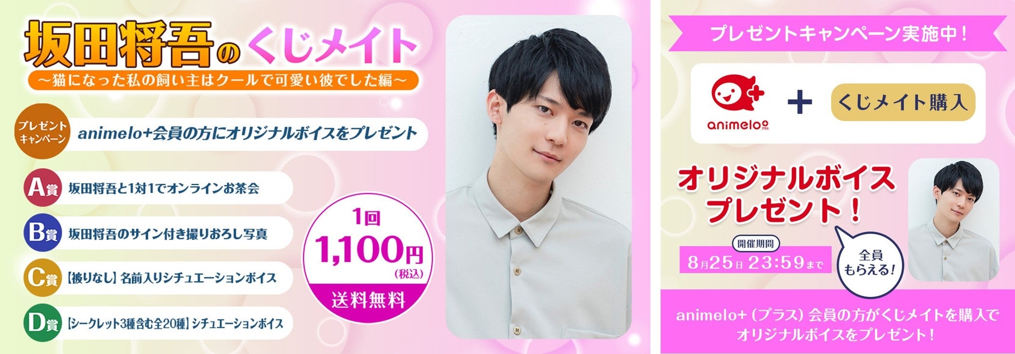 株式会社ドワンゴは、株式会社アニメイトが提供するオンラインくじサービス「くじメイト」にて、声優・坂田将吾のオンラインくじ「坂田将吾のくじメイト特番~猫になった私の飼い主はクールで可愛い彼でした編~」を2024年6月26日(水)~8月25日(日)までの期間限定で販売します。