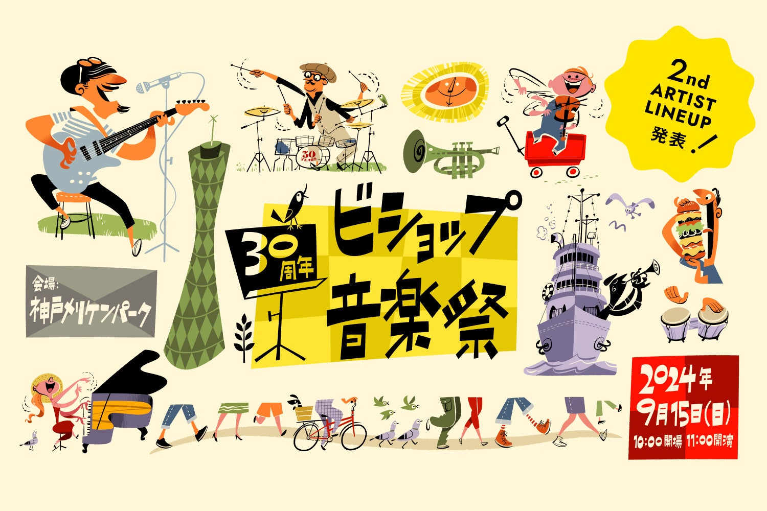 株式会社ビショップ(本社:兵庫県神戸市/代表取締役社長:森威)は、2024年9月15日(日) ビショップ30周年を記念して地元・神戸のメリケンパークを舞台に開催する、野外フェス「ビショップ音楽祭」。