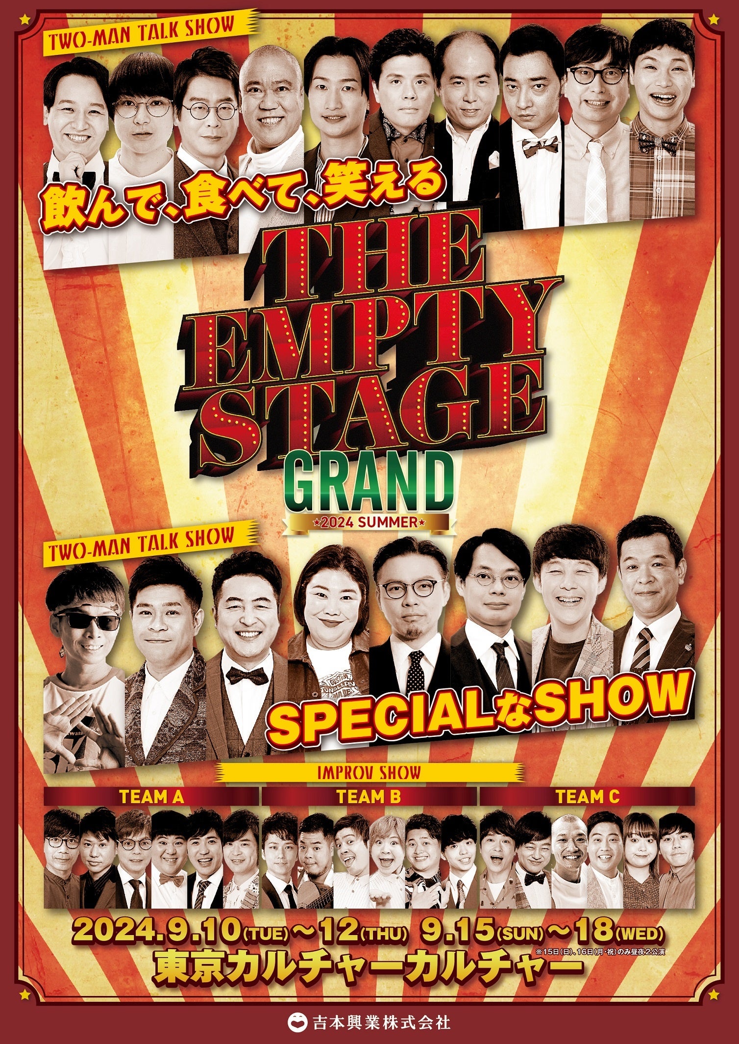 2024年9月10日(火)~12日(木)、9月15日(日)~18日(水)に新型エンタメコメディショー『THE EMPTY STAGE GRAND 2024 SUMMER』 を、東京カルチャーカルチャーにて開催することが決定いたしました。