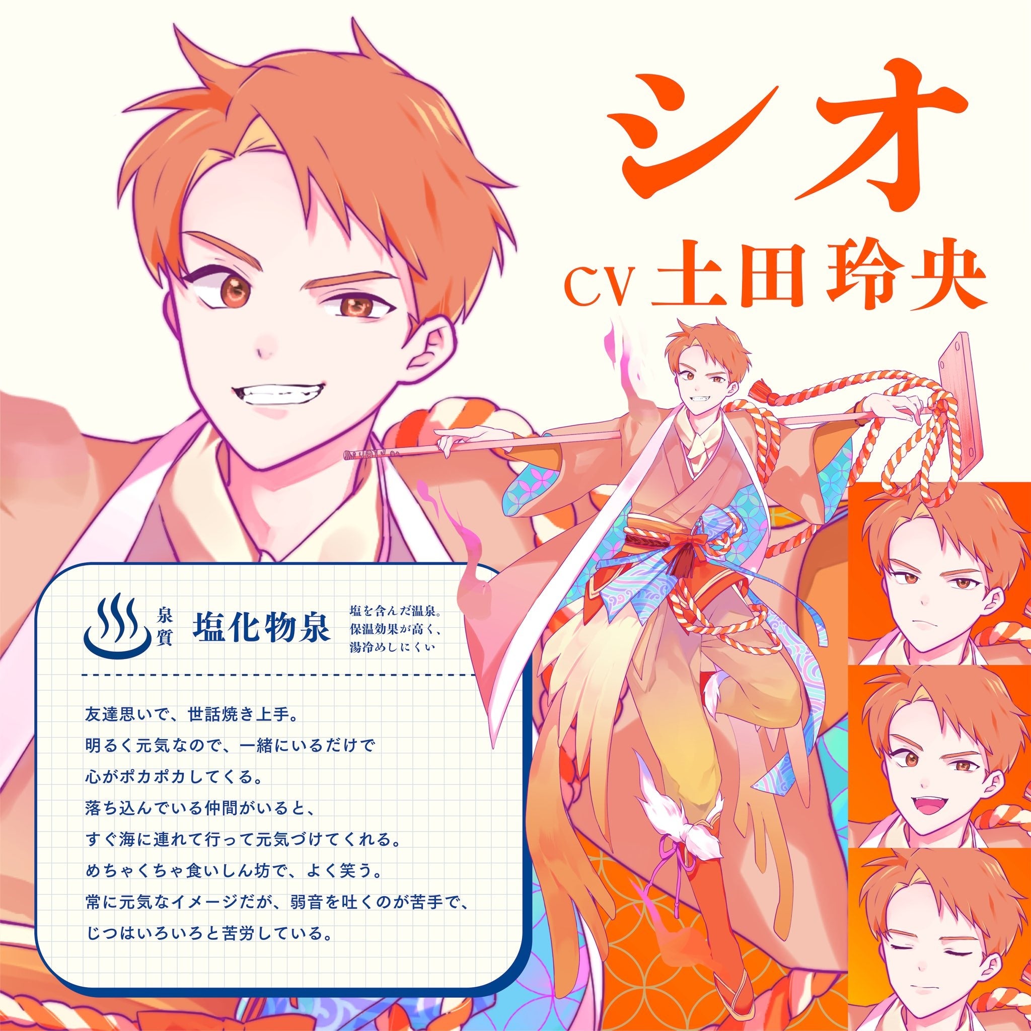 シオは塩化物泉という事で、ぽかぽかとあたたかい子で演じていても楽しいです。彼は人に心地よさを与える元気さなので暑苦しくならないよう適温を意識しています。あと、シオが海鮮丼海鮮丼と騒ぐたびに、わかる、わかるよぉと言う気持ちになります。