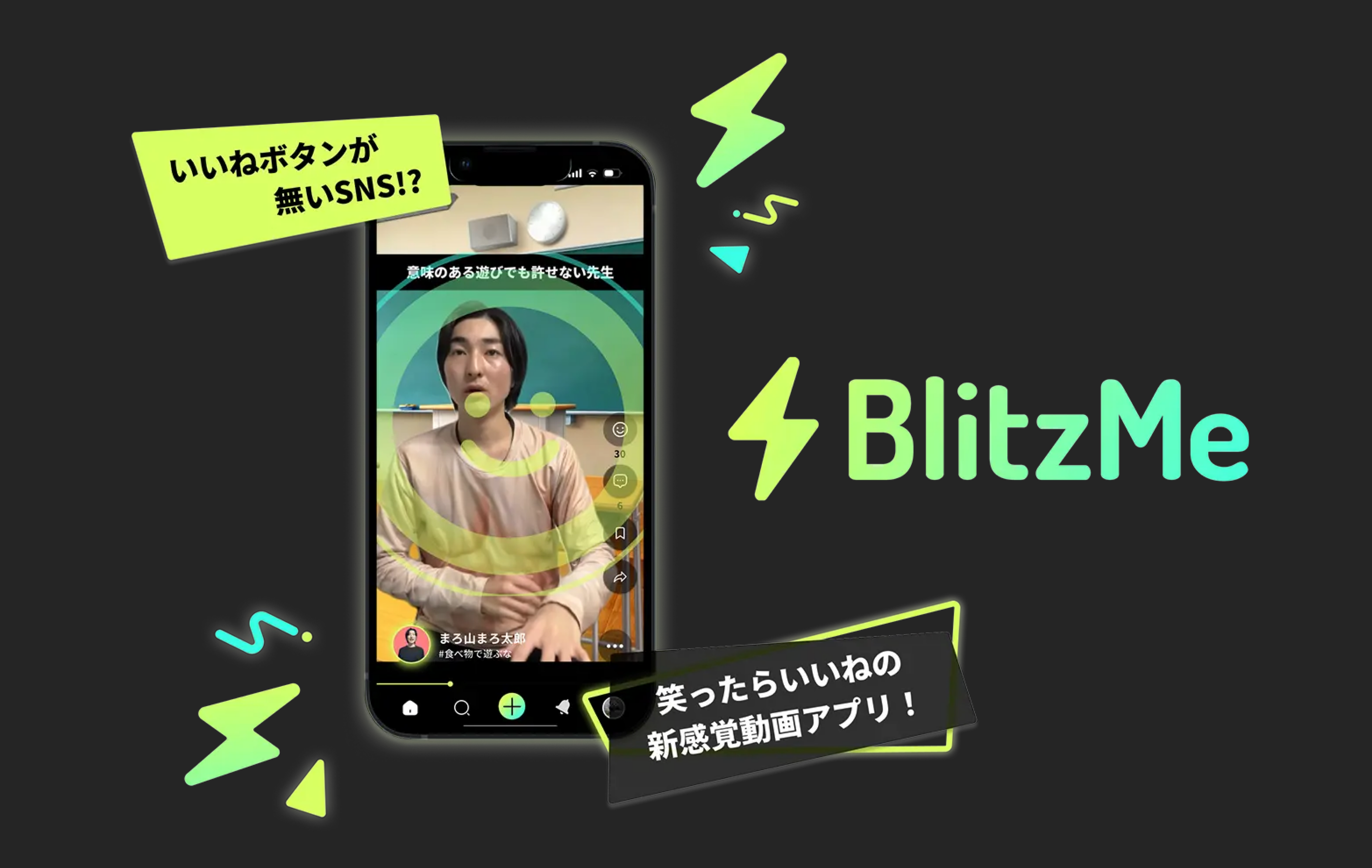 BlitzMeは笑顔になれるコンテンツに特化した、さまざまなジャンルのコンテンツがどなたでも楽しめる新感覚動画アプリです。いいねボタンがなく、ユーザーが笑うことでコンテンツにいいねがつく、独自の「笑い判定機能」が搭載されています。