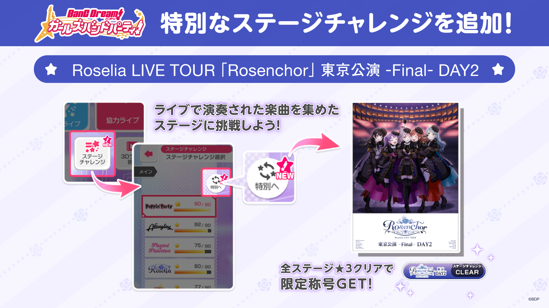 スマートフォン向けゲーム「バンドリ! ガールズバンドパーティ!」内、ステージチャレンジ「特別」に、本ライブで演奏された楽曲を集めたステージを追加しました。