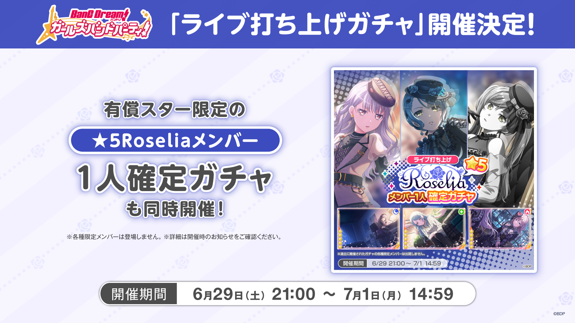 さらに、有償スター限定の★5Roseliaメンバー1人確定ガチャも同時開催中です。