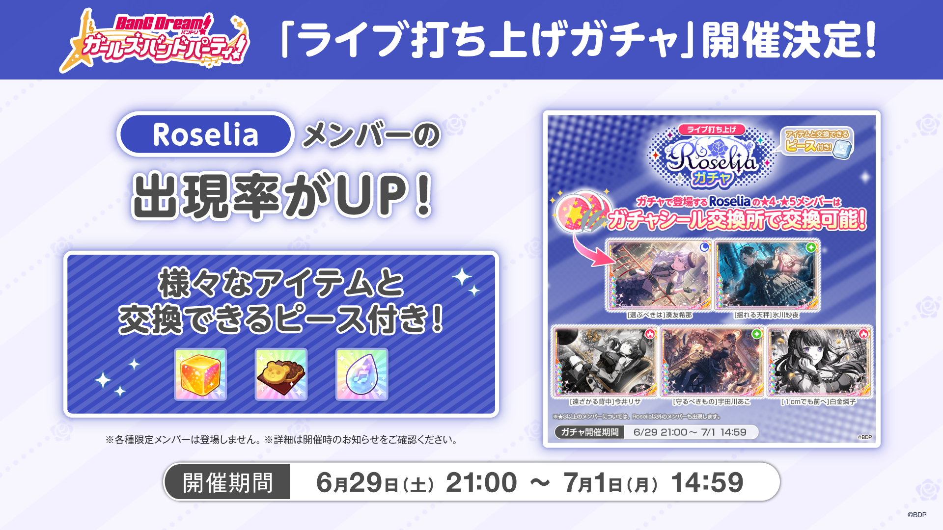 本ライブ開催を記念して、「ライブ打ち上げガチャ」が開催中です。Roseliaメンバーの出現率がアップするほ か、様々なアイテムと交換できるピース付きとなります。