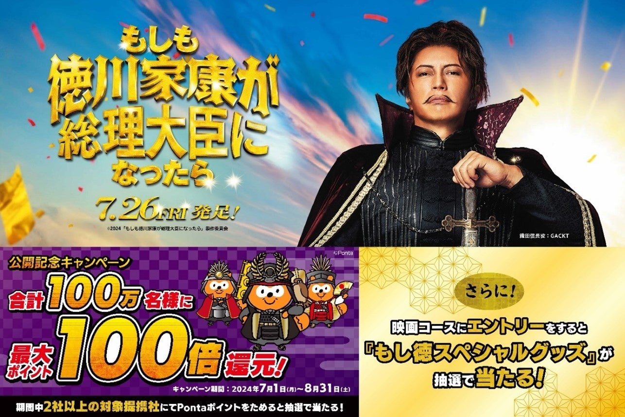 本キャンペーンには、Ponta提携社・サービスの54ブランド以上が参加します。エントリーなしでどなたも対象となり、期間中、対象のPonta提携社・サービスの2社以上を利用して、Pontaポイントをためた方の中から、抽選で合計100万名様に、ためたポイントの最大100倍のポイントをプレゼントします。さらにキャンペーンページから「映画コース」にエントリーをした方の中から、抽選で29名様に、『もし徳』で経済産業大臣・織田信長役を演じるGACKTさんの特大アクリルスタンドなどの「もし徳グッズ」をプレゼントします。