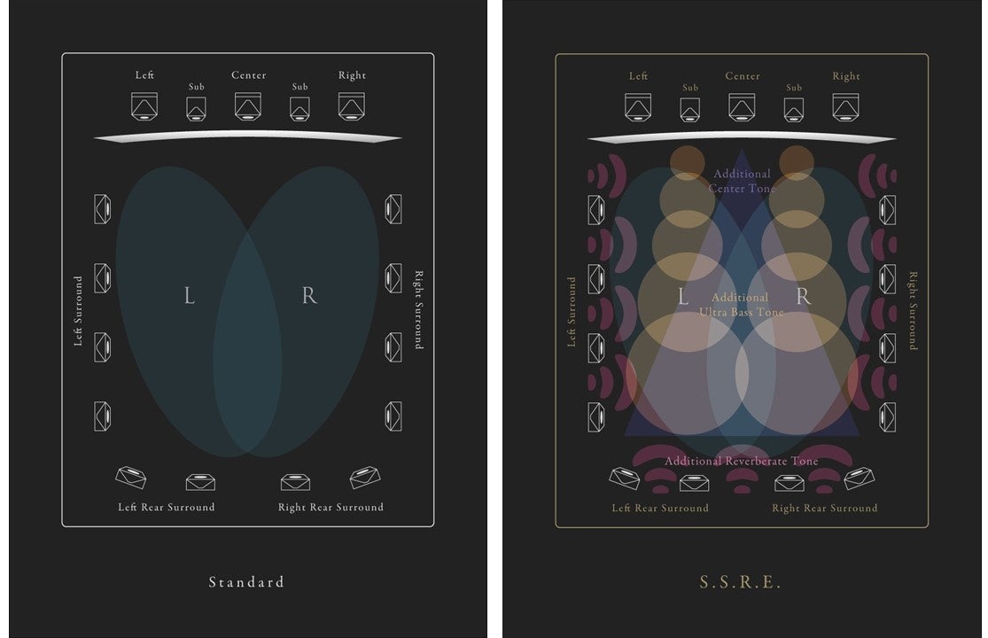 「SAION Super Real Effects(SSRE)」の根底にあるのは、「曇りなき正確な音」と称されるSAIONのサウンドシステムがあってこそ成り立ちます。究極に美しい音色が解き放たれる環境が絶対条件なのです。そのためには、当然メインスピーカーが上質であることは言うに及ばず、サブウーハー、サラウンドスピーカーも全てが上質でなくてはなりません。この美しいSAIONのサウンドシステムが奏でる音色に、アーティストがプレイしている空間の響きを精細に加える独自のプロセッシング技術が「SAION Super Real Effects(SSRE)」なのです。