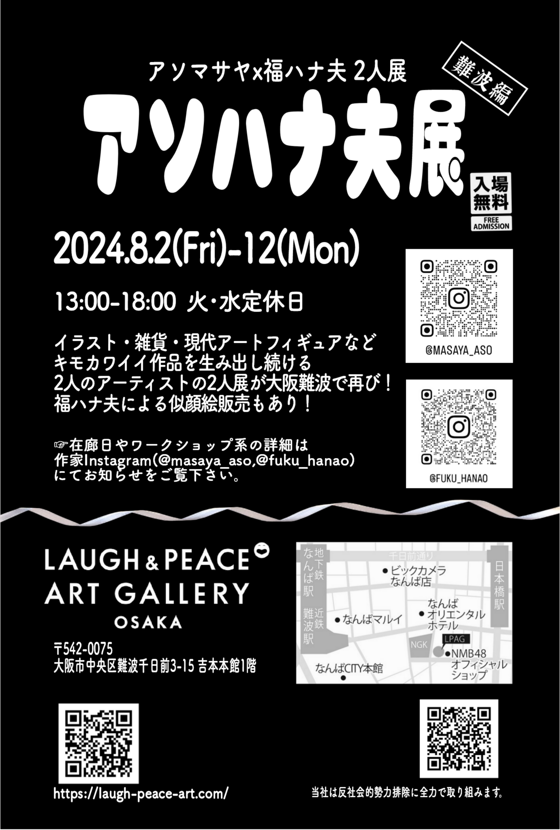 2024年8月2日(金)~12日(月・祝)の期間、大阪・ LAUGH & PEACE ART GALLERY OSAKAにて、アソマサヤ×福ハナ夫による2人展、「アソハナ夫展 難波編」を開催いたします。