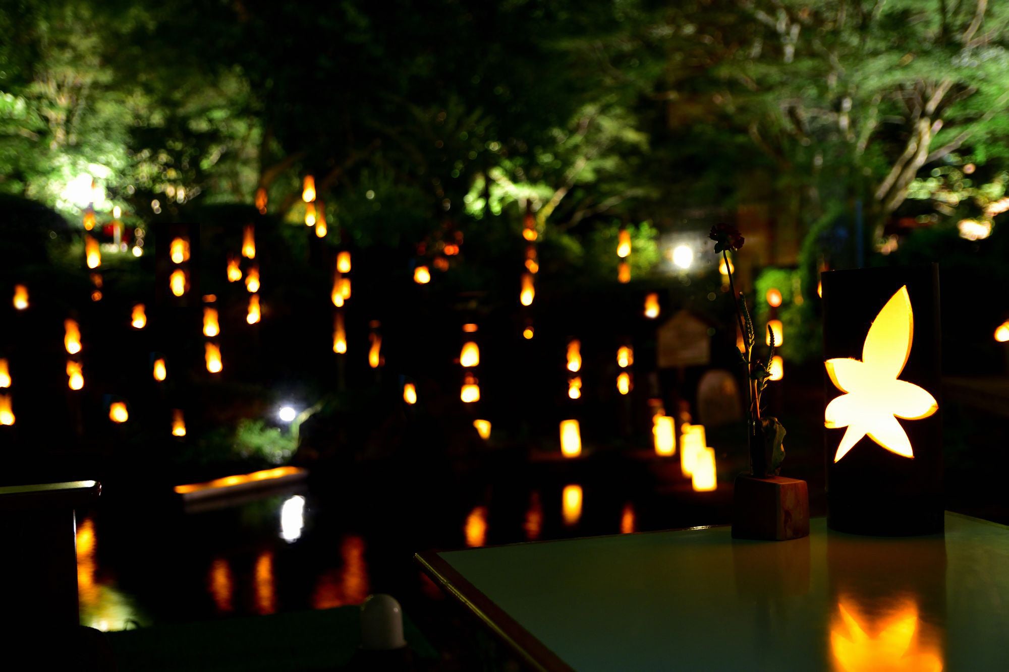 竹の側面をくりぬき、内にLEDキャンドルを入れた「竹灯り」には敷地内の青竹を使用。一本一本がスタッフによる手作りで、幻想的でいて温かみのある光が庭園を包み込む姿を、ロビーラウンジやお部屋からご鑑賞いただけます。