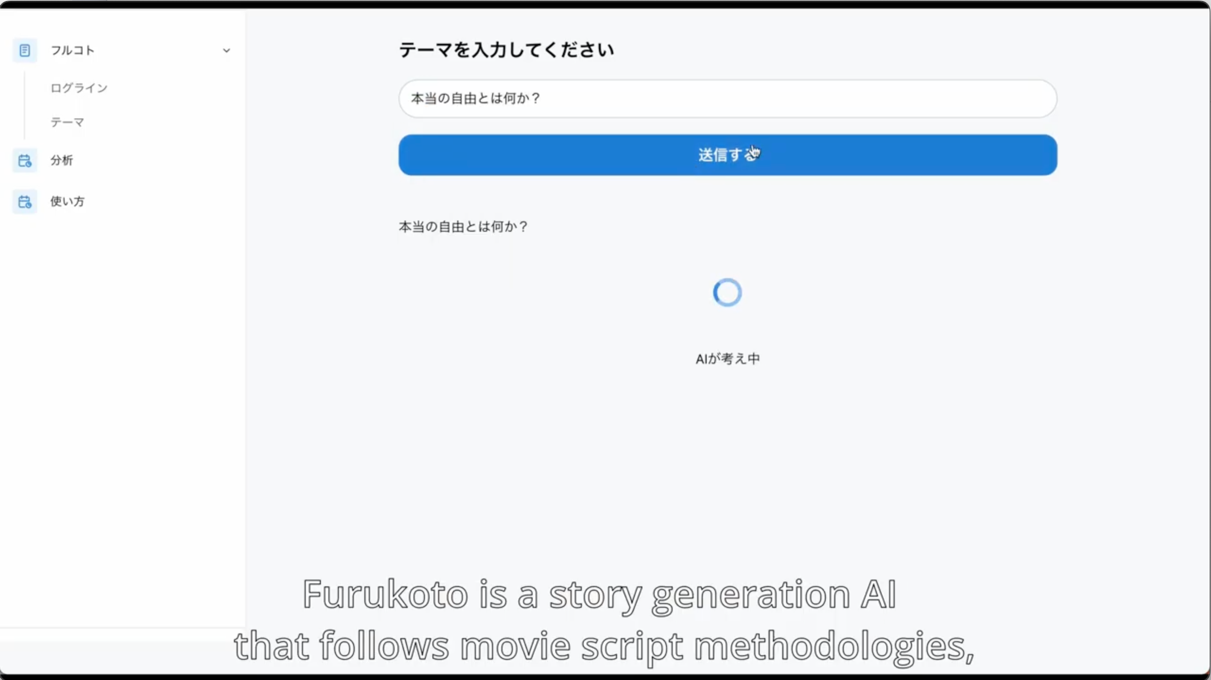 プレゼンテーション中の3分間の動画では「フルコト」の機能紹介が行われました。フルコトはテーマまたは簡単なあらすじ(ログライン)を入力することで幾層にも重ねられたストーリー構造による処理を実行し、わずか数秒から数十秒でストーリーを生成します。フルコトを利用する上で最も大切なことは人がAIに対しどのような問いを立てるかであり、人とAIの対話的な共同作業を行うことで、よりクリエイティブなストーリーを共作することができます。