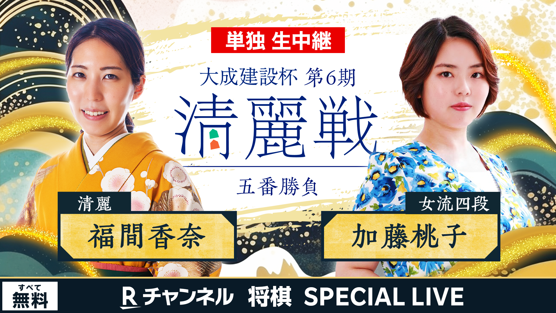 「大成建設杯第6期清麗戦五番勝負」は、2024年7月10日(水)の第1局から最大第5局まで行われる予定で、すべての対局をライブ中継にて「ライブ専門チャンネル」で単独配信します。今回の五番勝負は、福間 香奈清麗に加藤 桃子女流四段が挑む注目の対局となっており、「Rチャンネル」において将棋の対局のライブ配信を行うのは初めてとなります。本ライブ配信は実況・解説付きで配信し、第2局以降には乃木坂46の元メンバーで将棋アマチュア初段および将棋親善大使の伊藤 かりんさんが聞き手として参加予定です。また、見逃した方向けに、対局後に「将棋チャンネル」でのアーカイブ配信も予定しています。