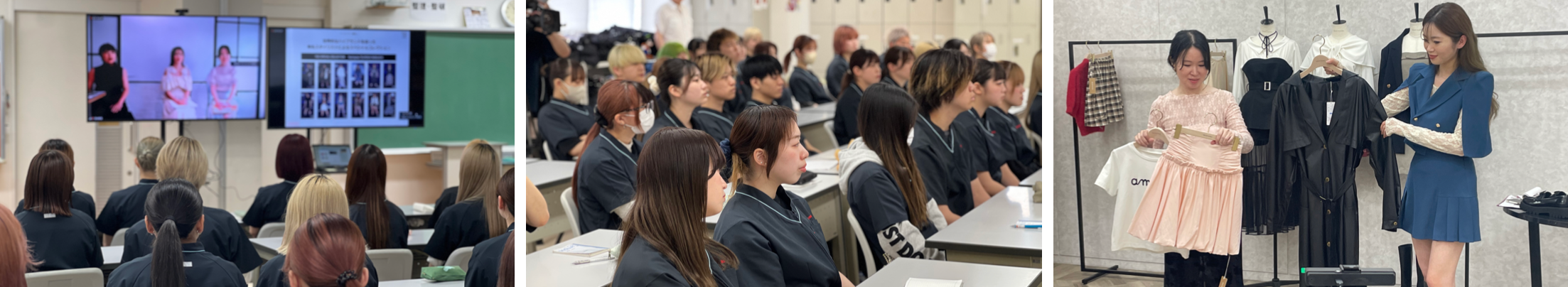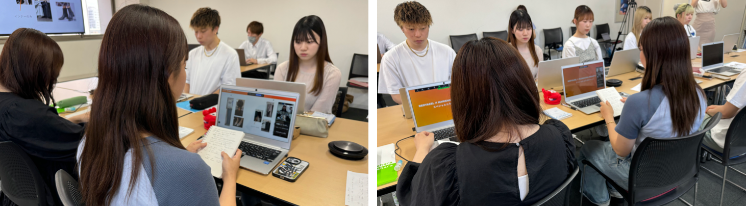 先月2024年6月6日(木)には、河原ビューティモード専門学校 美容学科に通う45名の学生たちに向けて、特別セミナー「ファッション業界最前線」をオンラインにて開催し、TGCの歴史や、REDYAZELに勤める現役スタッフによるリアルな現場の声、業務の内容などをレクチャー。(写真上、左および中央)さらに、『TGC MATSUYAMA 2024 スペシャルコラボステージ』をつくり上げる10名の選抜メンバーが、2024年6月19日(水)にREDYAZELのプレスルームにて実施された、TGC松山のREDYAZELのファッションショーで使用するコーディネート組みの現場にオンラインで参加。(写真上、右)それぞれの学びを経て、スペシャルコラボステージのコンセプトやコーディネート、ヘアメイクのイメージに至るまでを学生たちが考案し、昨日2024年7月3日(水)に、学生たちによるプレゼンテーションが行われました。(写真下)