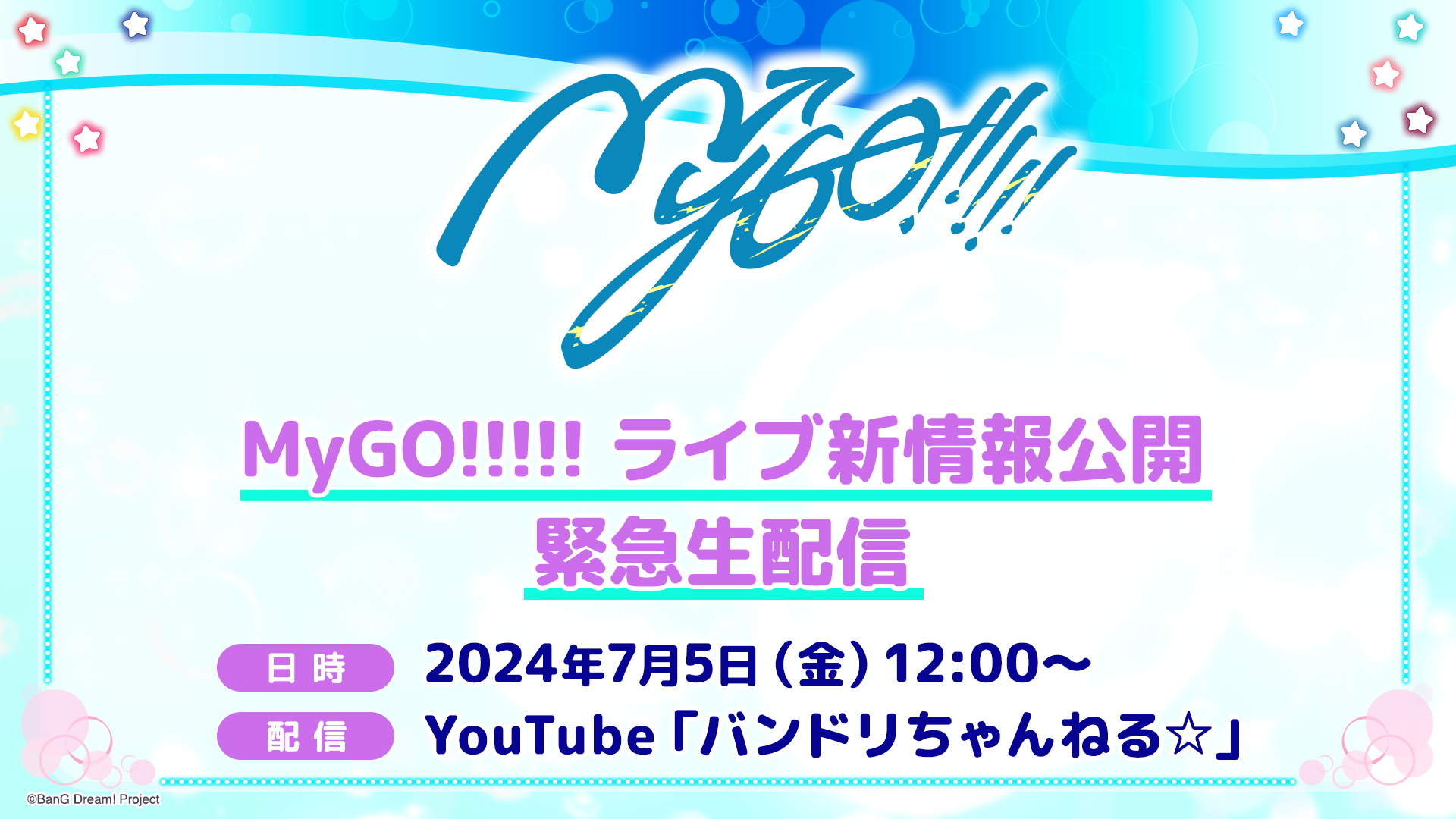 2024年7月5日(金) 12:00~より、YouTube「バンドリちゃんねる☆」にて、MyGO!!!!!のライブに関する新情報を発表する緊急生配信の実施が決定しました。