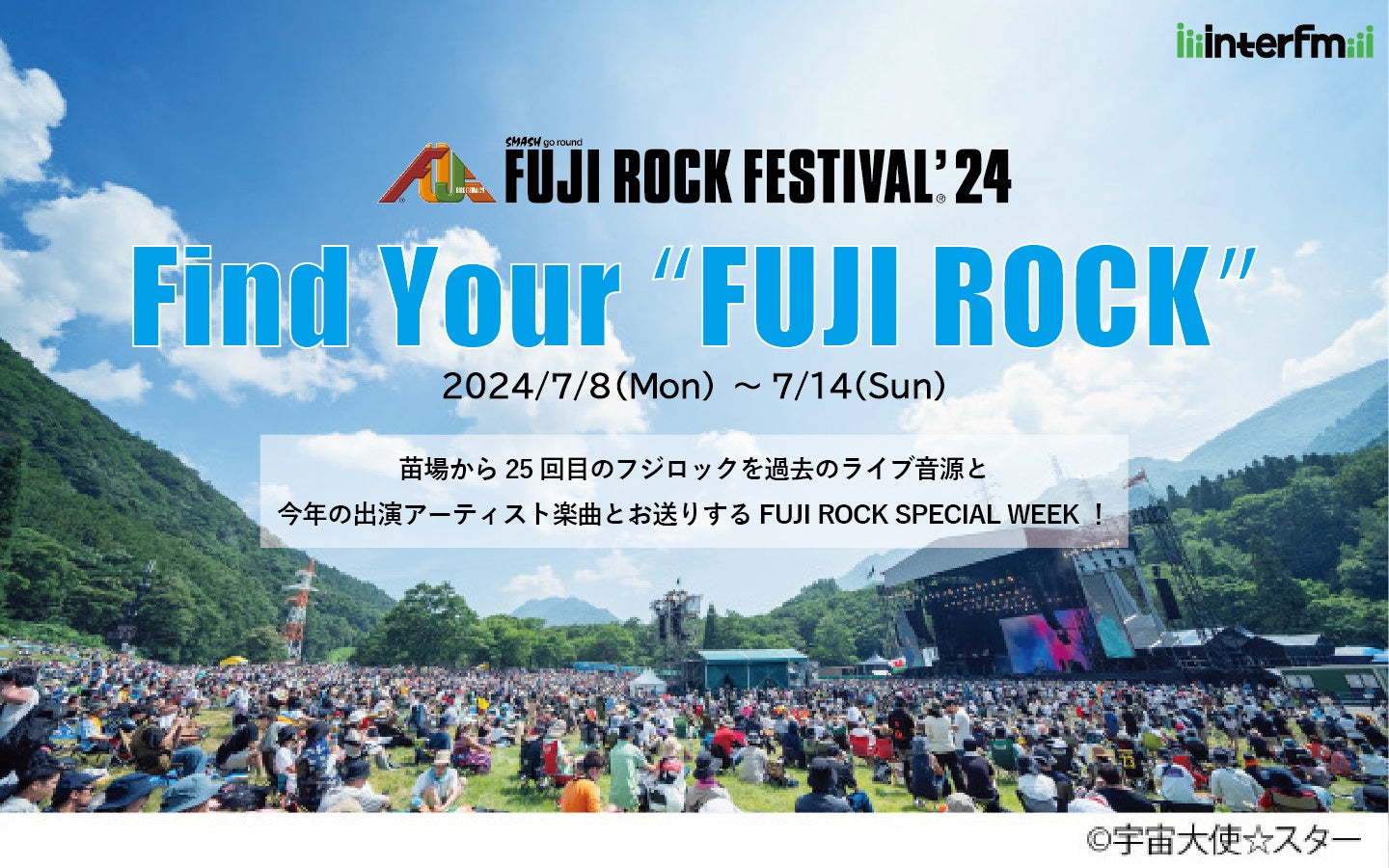 インターエフエム(東京:89.7MHz 横浜:76.5 MHz)は、2024年7月8日(月)から14日(日)までの1週間、『interfm Find Your “FUJI ROCK”』キャンペーンを実施いたします。
