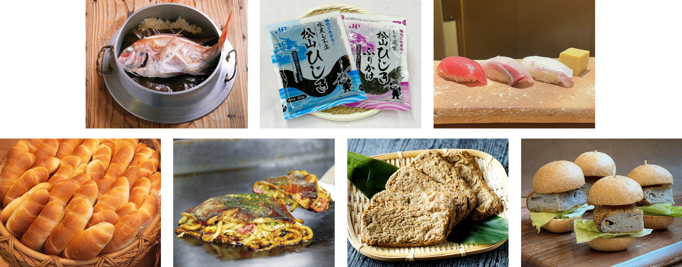 その他朝食には、愛媛県八幡浜市にある「パン・メゾン」にて生まれた元祖「塩パン」、主食には、小麦粉をクレープ状に伸ばし、魚粉を振りかけた生地に、キャベツやちくわ、肉、卵、そばなどの具材を入れ、甘辛いソースをたっぷりとかけて食べる三津浜のソウルフード「三津浜焼き」、おかず/惣菜には、愛媛県で水揚げされる新鮮な「ホタルジャコ」などの小魚を1匹1匹手作業で捌き、昔ながらの石うす製法で骨と皮ごとすり身にした「安岡蒲鉾」の昔ながらのじゃこ天「宇和島じゃこ天」や「じゃこカツバーガー」、さらに日本有数のみかん産地である愛媛県ならではの「みかん」を使用した様々なスイーツや、地元・学校法人河原学園の学生とコラボレーションした「レモンケーキ」が並ぶ他、「蛇口からみかんジュースが出る!」と話題を呼んだ「みかん蛇口」も登場します!