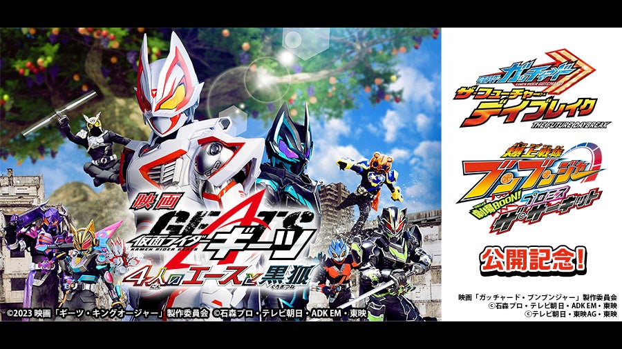 このたび配信を開始する映画 『仮面ライダーギーツ 4人のエースと黒狐』は2022年から2023年にかけてテレビ放送されていた、令和仮面ライダーシリーズ第4作「仮面ライダーギーツ」の長編劇場版。未来人・メラ&メロが始めた「世界滅亡ゲーム」によって、世界は4つに分断され、英寿も世界と一緒に4人に分裂!?英寿と世界の危機に、仮面ライダータイクーン、ナーゴ、バッファ、ケイロウ、ロポ、パンクジャックも駆けつけるが、彼らの前に立ちはだかるのは史上最強のプレイヤー・仮面ライダークロスギーツ!!英寿、そして世界の運命は!?驚異と感動のノンストップ・アクションは、大人から子供まで世代を超えて夢中になること間違いなし!カラオケルームならではの臨場感あふれる音と映像でお楽しみいただけます。この機会に、お子さまと一緒にお近くのカラオケルームで楽しいひとときを過ごしてみてはいかがでしょうか。
