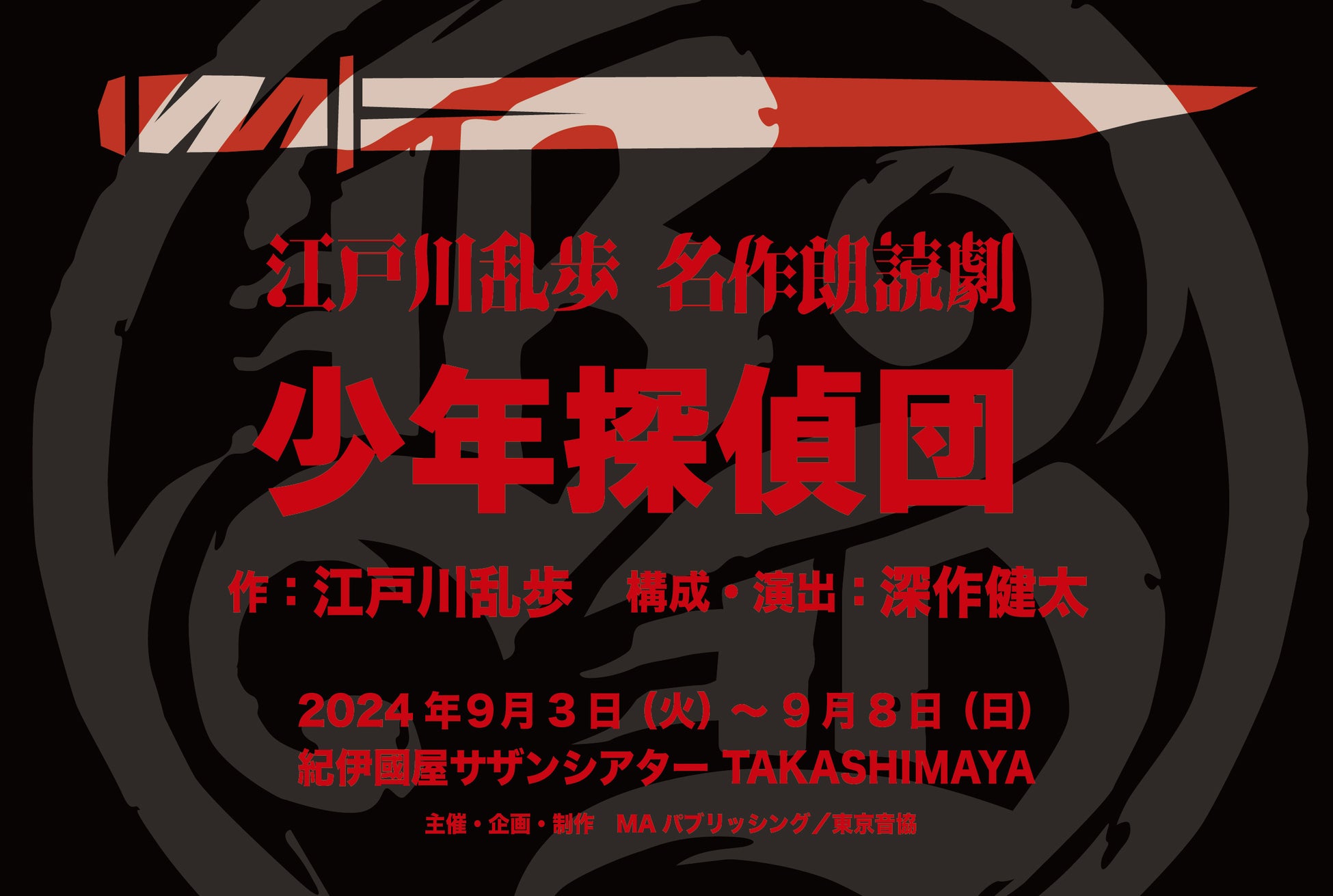 9月3日(火)~ 8日(日)まで、東京・紀伊國屋サザンシアターTAKASHIMAYAにて「江戸川乱歩 名作朗読劇『少年探偵団』」を6日間9公演上演することが決定いたしました。