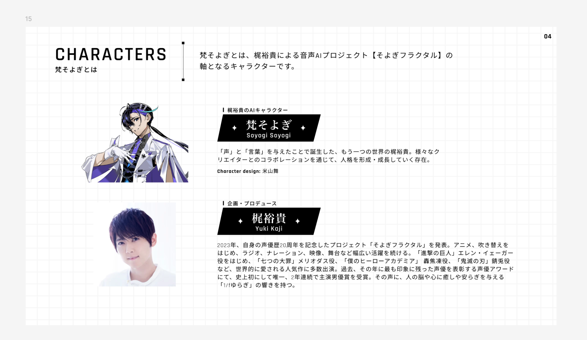 梶裕貴・声優活動20周年記念プロジェクト【そよぎフラクタル】のキャラクター。梶自身の声をベースに創造された音声AIキャラクターです。『梵そよぎ』の詳細な設定や特徴については、公式サイト(https://www.soyogi-fractal.com )および公式X(@kai_project)にて、順次公開されています。