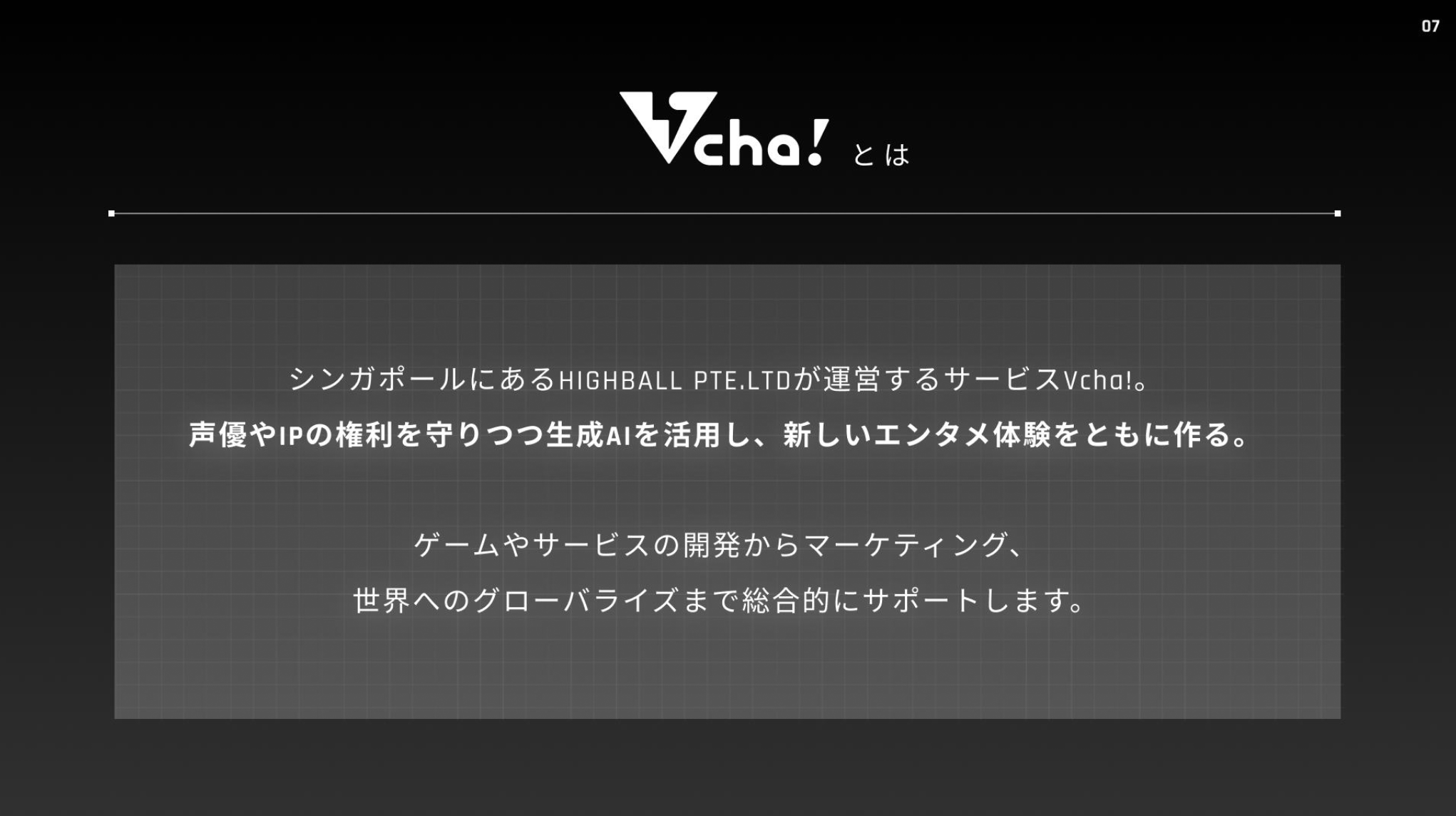 HIGHBALL PTE LTDは、最新のAI技術を活用したエンターテインメントサービスの開発・提供を行うテクノロジー企業です。「Vha!」アプリの開発元として、AIと人間のコミュニケーションの新しい形を模索しています。