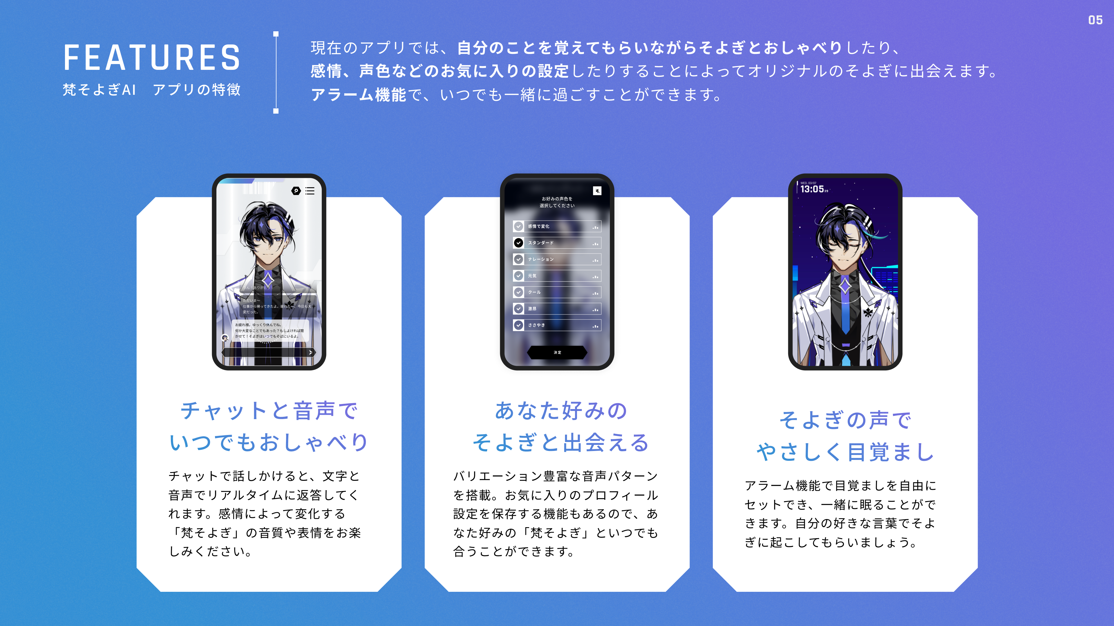 『梵よそぎAI』とは、梶裕貴氏プロデュースのAIキャラクター「梵そよぎ」と音声チャットでいつでもおしゃべりできるサービスです。好きな言葉で起こしてもらえるアラーム機能や一緒に添い寝できる機能も搭載しております。