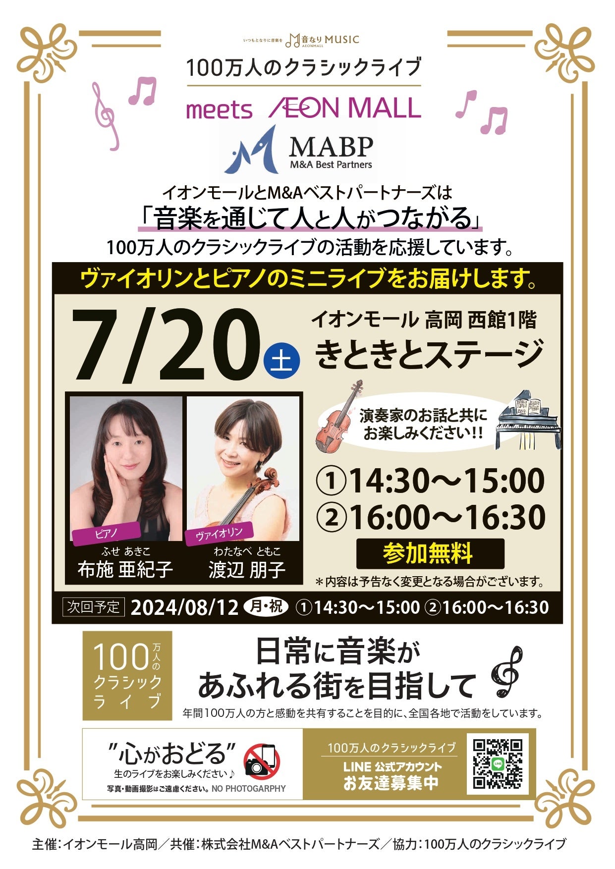 100万人のクラシックライブは、あらゆる人の日常に音楽の感動を届けることで、孤立を防ぎ穏やかで心豊かな社会生活を取り戻すきっかけとし、支え合いの輪を広げることを目指し、多くの方が行き交う『イオンモール高岡』にてライブを開催いたします。