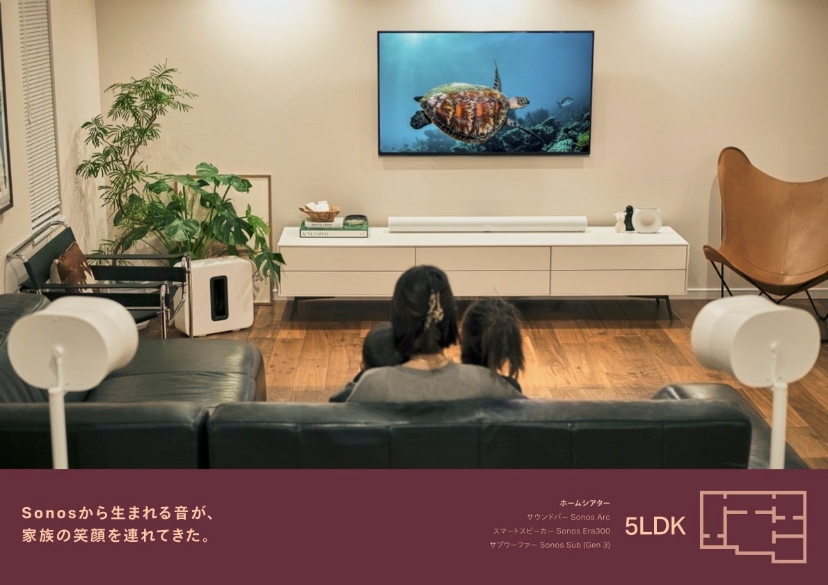 • Sonos製品のある暮らし:子ども達が好みの動画を見たり、音楽に合わせて踊りだすリビングルーム。サラウンドサウンドが楽しめるホームシアター環境をサウンドバー「Sonos Arc」と2台の「Sonos Era 300」、ウーファー「Sonos Sub (Gen 3)」で構築し、臨場感のある音で子ども達も大満足。映画館の本格的な音の迫力さながらに、家族で映画を楽しむことがでる。