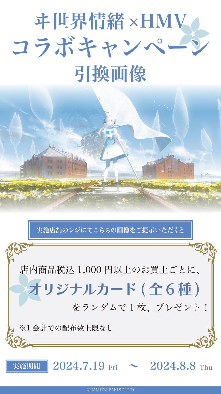 本キャンペーンでは、25店舗のHMV&BOOKSおよびHMVにて、商品ご購入時に「KAMITSUBAKI STUDIO」所属のバーチャルダークシンガー「ヰ世界情緒」のオリジナルカード(全6種)を配布いたします。また、本企画のために撮りおろした限定オリジナルボイスによる店内放送が実施店舗にて放送されます。