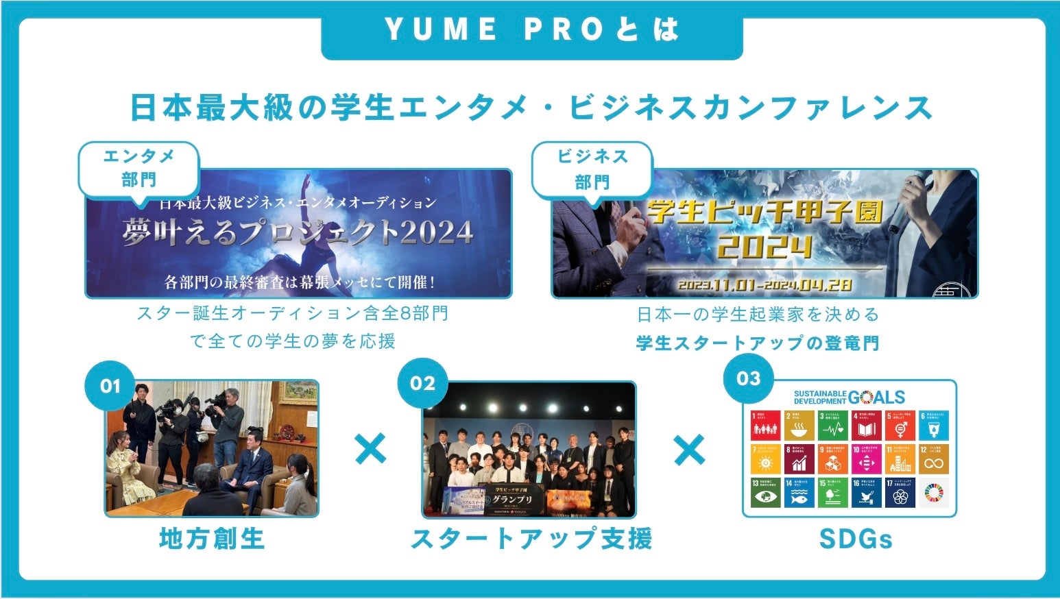 「YUME PRO(夢叶えるプロジェクト)」は、「地方創生」×「スタートアップ支援」×「SDGs」を通して、全ての学生の夢を応援する日本最大級の学生ビジネス・エンタメコンテストです。「YUME PRO(夢叶えるプロジェクト)2024」では 株式会社クレドインターナショナルが運営するエンタメレストランSAKURAが冠スポンサーとなり、⽇本全国で様々なオーディションやイベントを開催しました。2024年4⽉27⽇、4⽉28⽇「ニコニコ超会議2024」( 幕張メッセ 国際展⽰場 1〜11ホール・イベントホール)にて“YUME PRO(夢叶えるプロジェクト)最終審査・ 授賞式 を開催しました。 アンバサダーを務める仲川遥⾹氏や林襄(リン・シャン)氏の特別出演、特別審査員 アパホテル株式会社 代表取締役専務 元⾕ 拓氏などに出席して頂きました。配信や動画・書類などの予選を経て 最終審査、全9部⾨から1名ずつグランプリが決定しました。今年度も「YUME PRO(夢叶えるプロジェクト)2025」を⽇本全国で開催予定です。