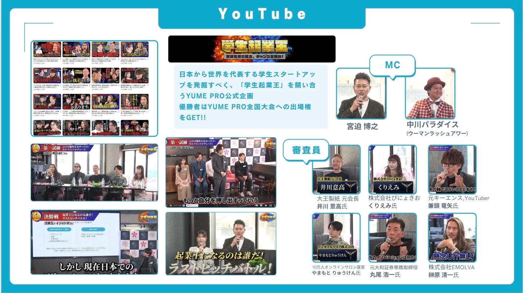 YUME PROは、学生の夢を叶える環境として、映画、YouTube、ラジオなど豊富なコンテンツを用意しています。また、学生間、学生と社会人間の交流を促進するため、YUME PRO公式イベントを年中開催しています。