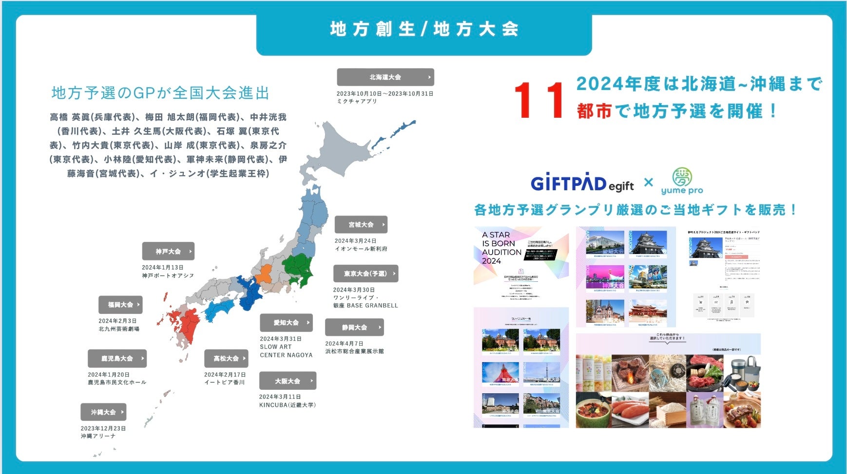 地方の学生にも平等に機会を提供するため、11都市でYUME PRO地方予選を開催し、地方創生×スタートアップ支援を推進しました。また、各地方予選グランプリの学生が厳選した地元の名産品のセレクトパッケージをGIFTPAD様と特設ページを作り、インターネットを通し全国から購入できる仕組みを作り、地方創生に取り組みました。
