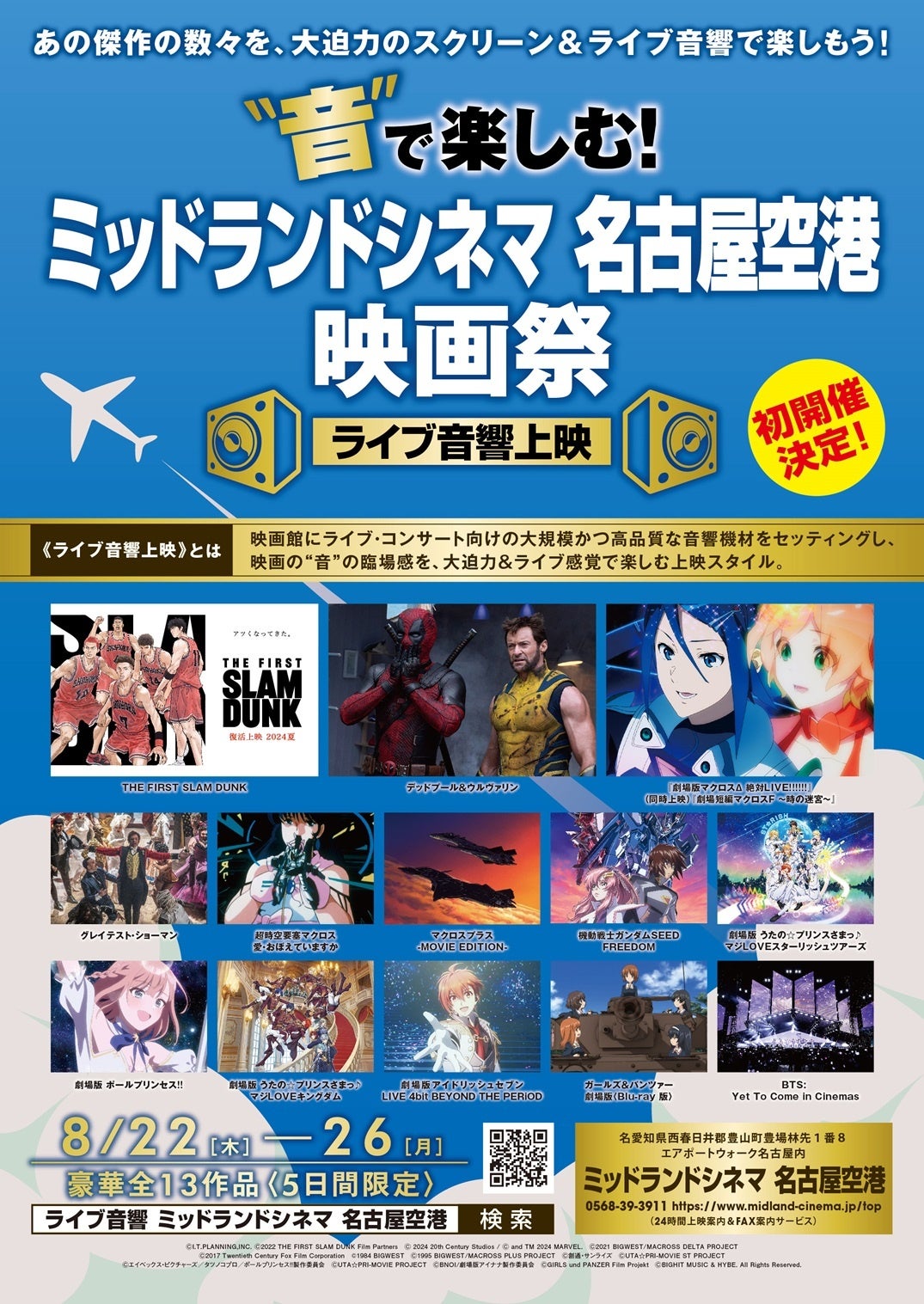 映画を“音”で楽しむ!というコンセプトをもとに、映画館にライブ・コンサート向けの大規模かつ高品質な音響機器をセッティングし、映画の“音”の臨場感を、大迫力&ライブ感覚で浴びるように楽しむ映画祭『“音”で楽しむ!ミッドランドシネマ 名古屋空港映画祭≪ライブ音響上映≫』が、2024年8月22日(木)~26日(月)≪5日間限定≫にて、愛知県のミッドランドシネマ 名古屋空港にて初開催決定!「映画は、映画館の大スクリーン&大迫力で存分に楽しんでもらいたい」という思いを込めて、映画・アニメ・ミュージカルなど、あらゆるジャンルから選りすぐりの傑作ラインナップ13作品を集めてお届けいたします。
