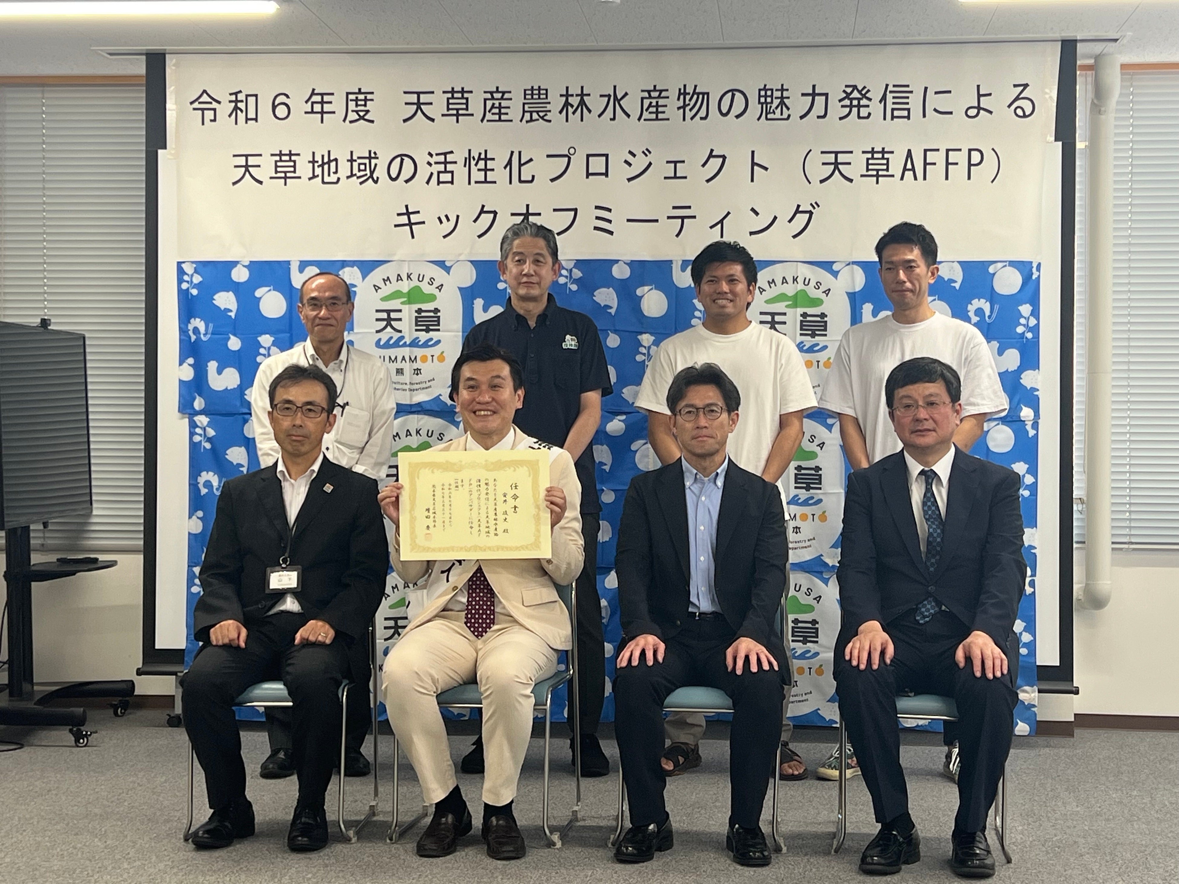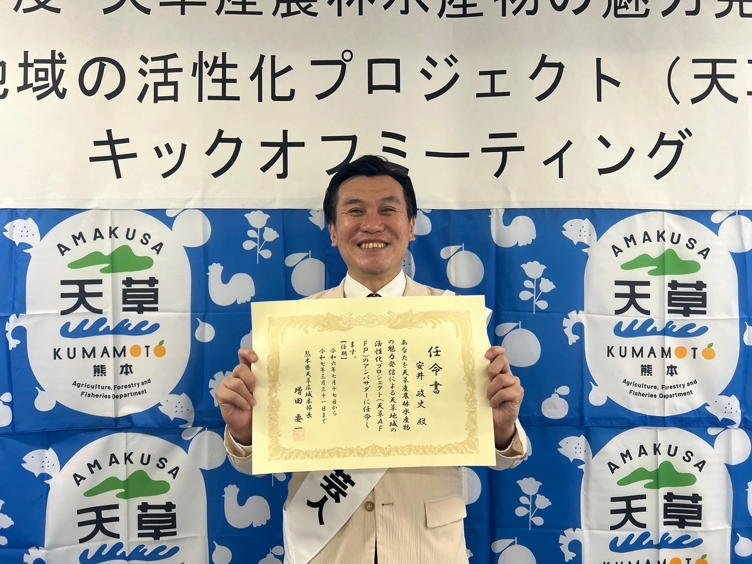 2024年7月17日(水)熊本県天草広域本部にて、天草産農林水産物の魅力発信による天草地域の活性化プロジェクト「天草AFFP」にかかるキックオフミーティングが開かれ、熊本県住みます芸人の安井政史がアンバサダーに任命されました。